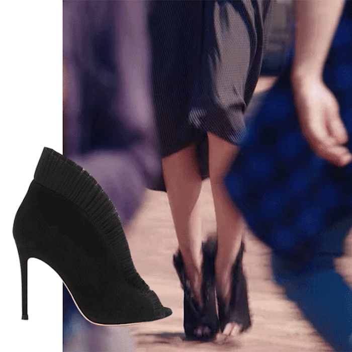 Trong phim Seo Ye Ji thực sự ghiền giày cao gót, mỗi bộ cánh cô lại đi một đôi cao gót sang chảnh được mix&match cực kỳ hợp gu. Với bộ đầm đen chấm bi với chi tiết xếp bèo yểu điệu kiểu hoàng gia, Seo Ye Ji chọn đôi boots gót nhọn của Gianvito Rossi.