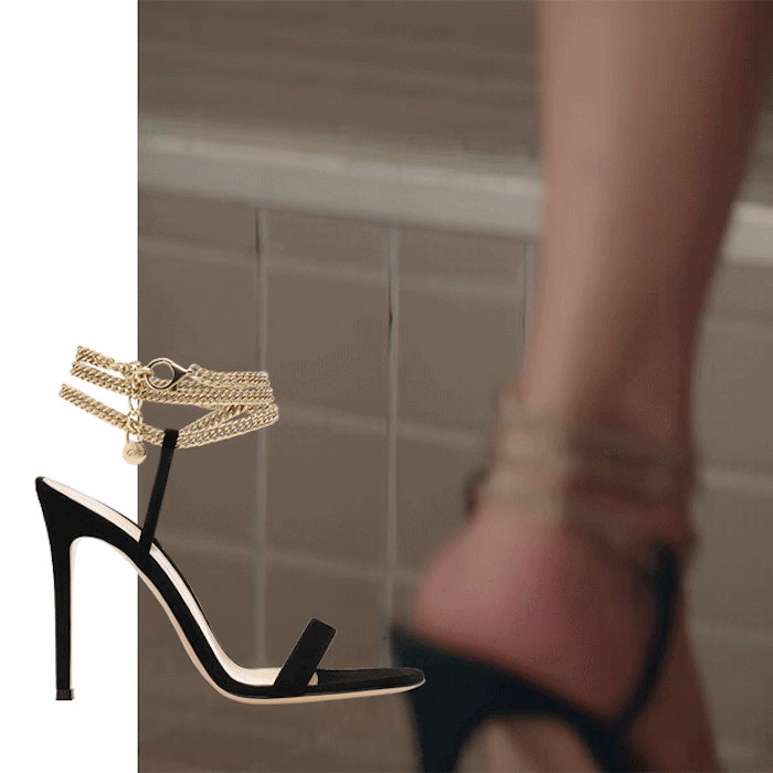 Một đôi giày đẹp có thể tạo nên ánh hào quang cho phụ nữ. Lại thêm một thiết kế đến từ thương hiệu Gianvito Rossi làm nên nét sang chảnh kiêu kỳ cho điên nữ "Điên Thì Có Sao". Thiết kế gót nhọn, quai mảnh nhưng nổi bật với những sợi dây chuyền vàng mỏng quấn quanh mắt cá chân, giống như một chiếc vòng cổ trang trí cho đôi chân cực phẩm của cô nàng.