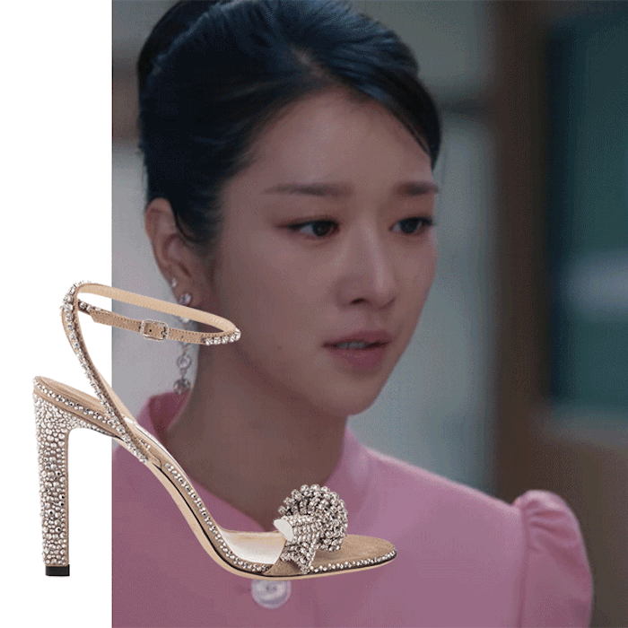 Nhưng tất cả chưa là gì so với đôi sandals đính đá hiệu Jimmy Choo đồng hành cùng Seo Ye Ji trong tập 6. Seo Ye Ji từng khiến dân tình choáng váng khi để lộ vòng eo siêu thực nhỏ đến khó tin khi diện set crop top cùng chân váy cạp cao màu hồng của thương hiệu Min Ju Kim. Và mỗi bước chân của cô dường như phát sáng khi diện đôi sandals trong BST mới nhất của Jimmy Choo.