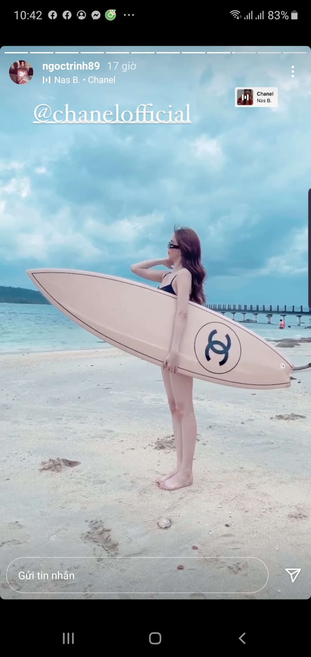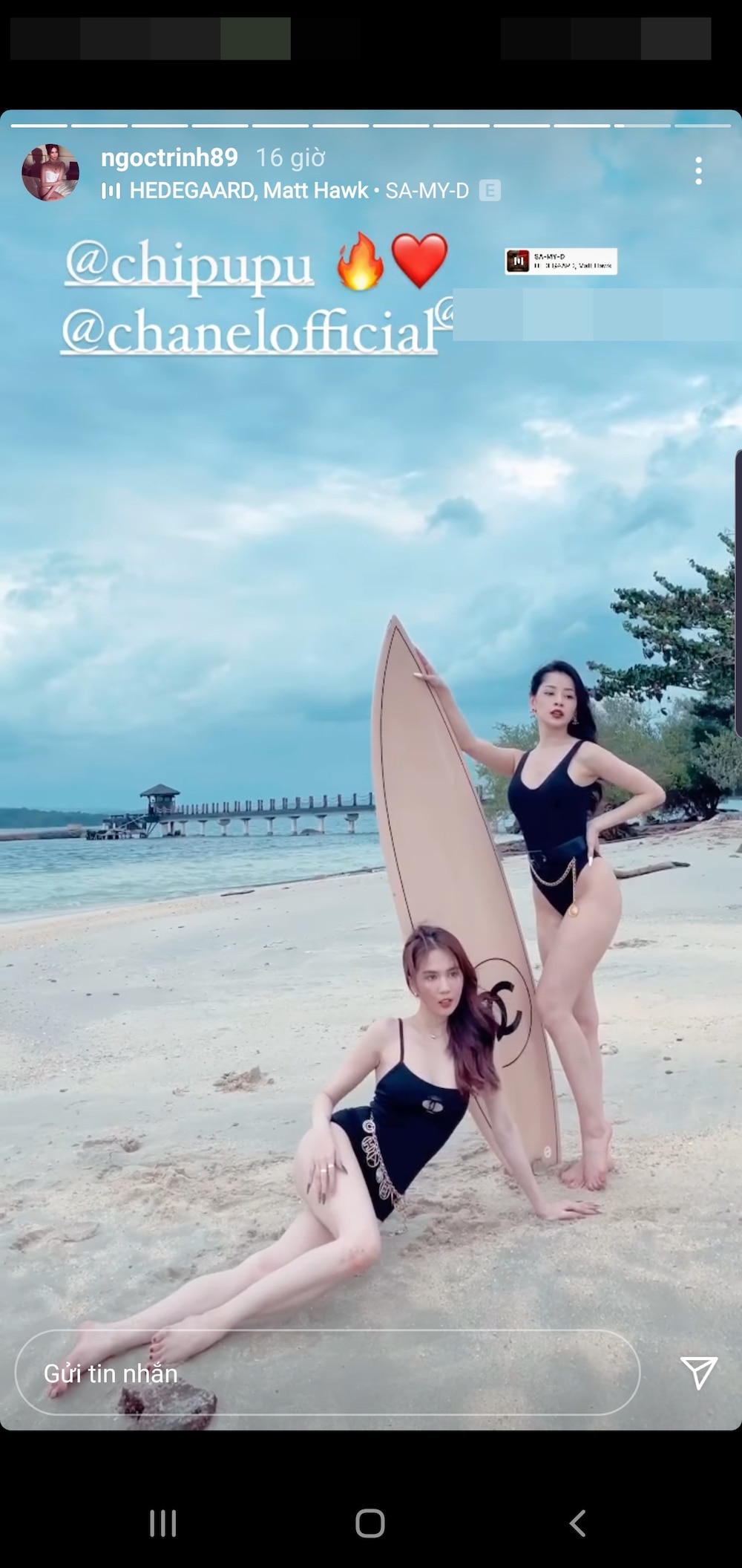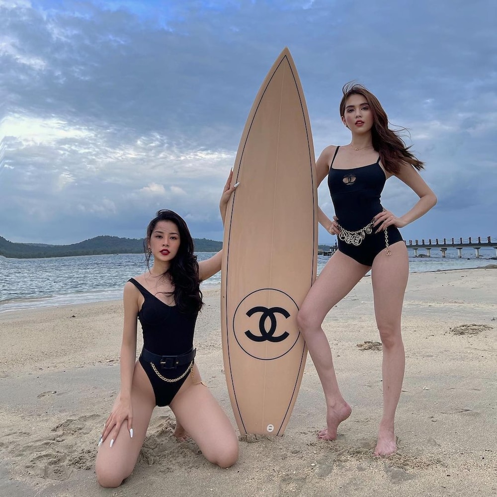 Mới đây, Ngọc Trinh đã đăng tải lên story bộ ảnh của mình và Chi Pu cùng tạo dáng gợi cảm trong trang phục bikini cùng tấm ván trượt đắt đỏ trên bãi biển.