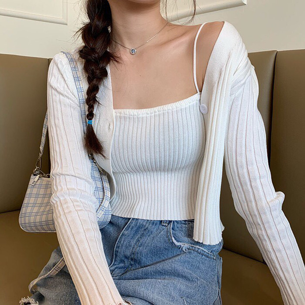 Khác với những lần ăn diện cá tính, lần này Ngọc Trinh chọn set đồ dệt kim có gân với gam màu hồng yêu thích, mix crop top hai dây cùng chân váy dài, khoác thêm chiếc cardigan mỏng nhẹ hờ hững để lộ một bên vai. Công bằng mà nói, Ngọc Trinh trong outfit này toát lên vẻ dịu dàng, trẻ trung và không kém phần gợi cảm.
