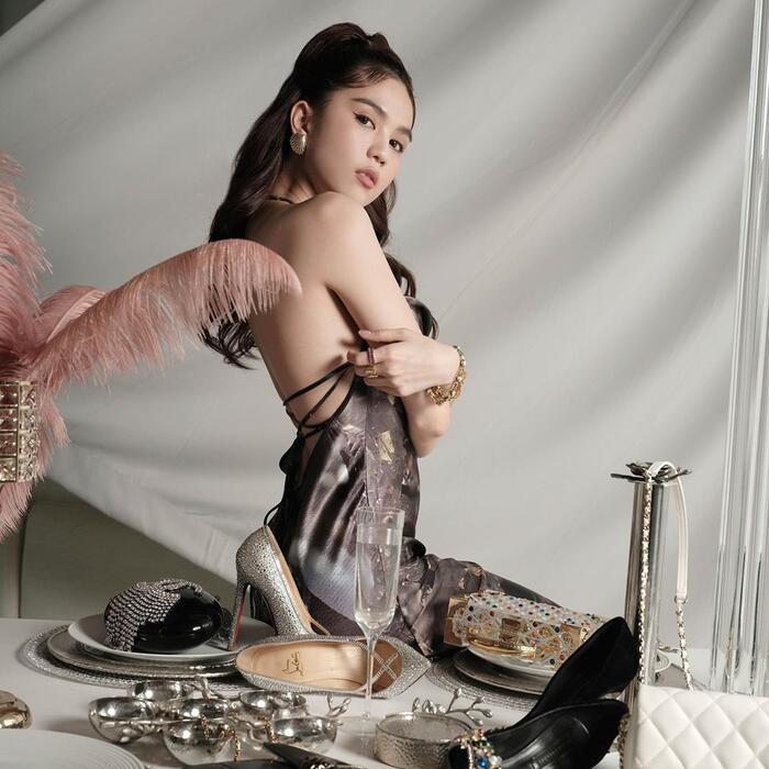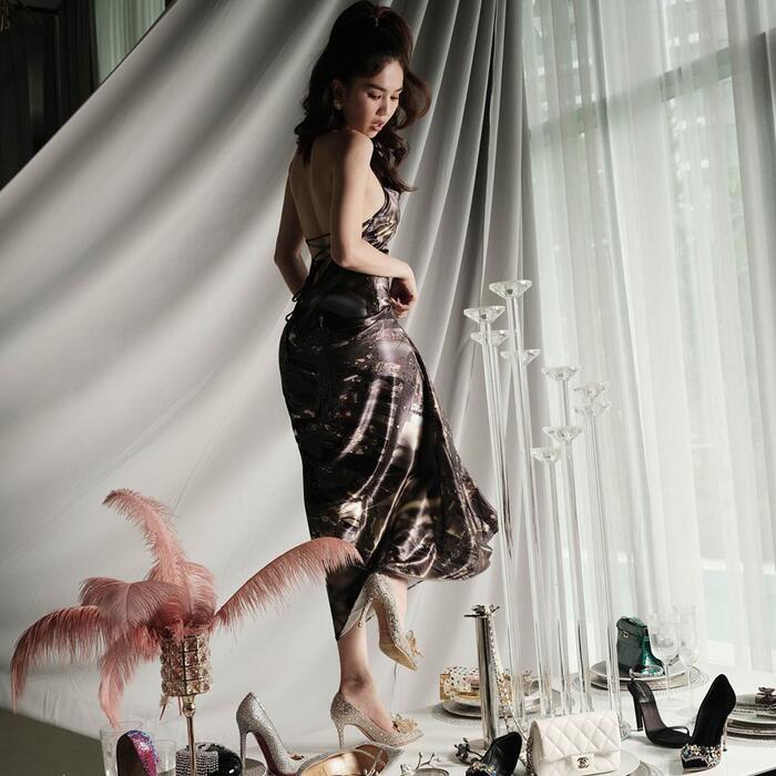 Trong loạt ảnh khác, Ngọc Trinh tiếp tục khoe lưng trần với mẫu váy đan dây chất liệu satin sang trọng. quyến rũ.