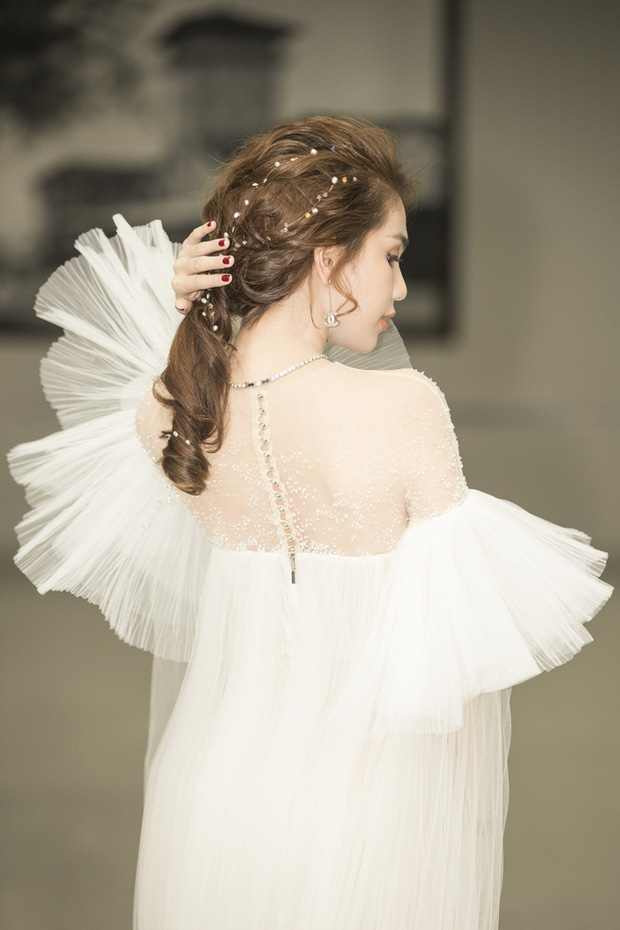 Nếu 2 năm trước đã chọn diện những bộ váy màu nổi thì lần này Ngọc Trinh lại nhẹ nhàng thanh tao với váy trắng bồng bềnh. Kết hợp cùng đó là kiểu tóc búi thấp đính ngọc trai giúp cô càng thêm bội phần mong manh nữ tính.