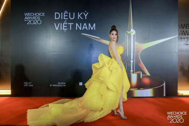 Thiết kế mang sắc màu nổi bật cộng thêm phần tùng váy xòe rộng giúp Ngọc Trinh chiếm trọn spotlight thảm đỏ, chặt chém hết dàn khách mời khác của WeChoice Awards lần này.