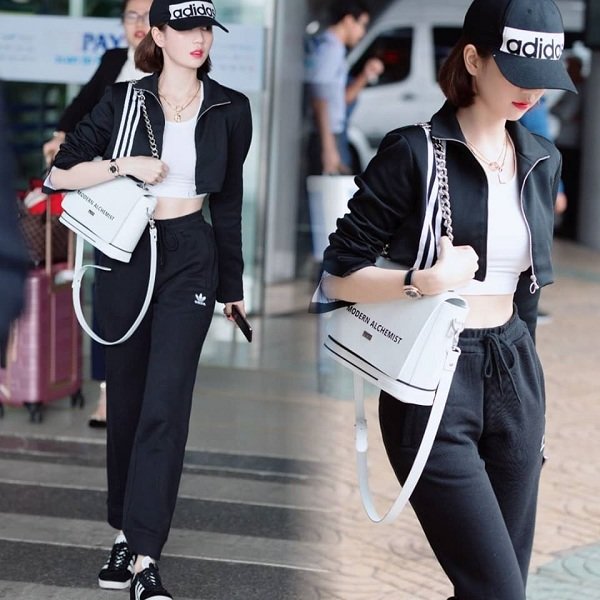 Diện sét đồ thể thao của Adidas, Ngọc Trinh vô cùng thoải mái, năng động và trẻ trung. Cô cũng có màn kết hợp các phụ kiện một cách xuất sắc.