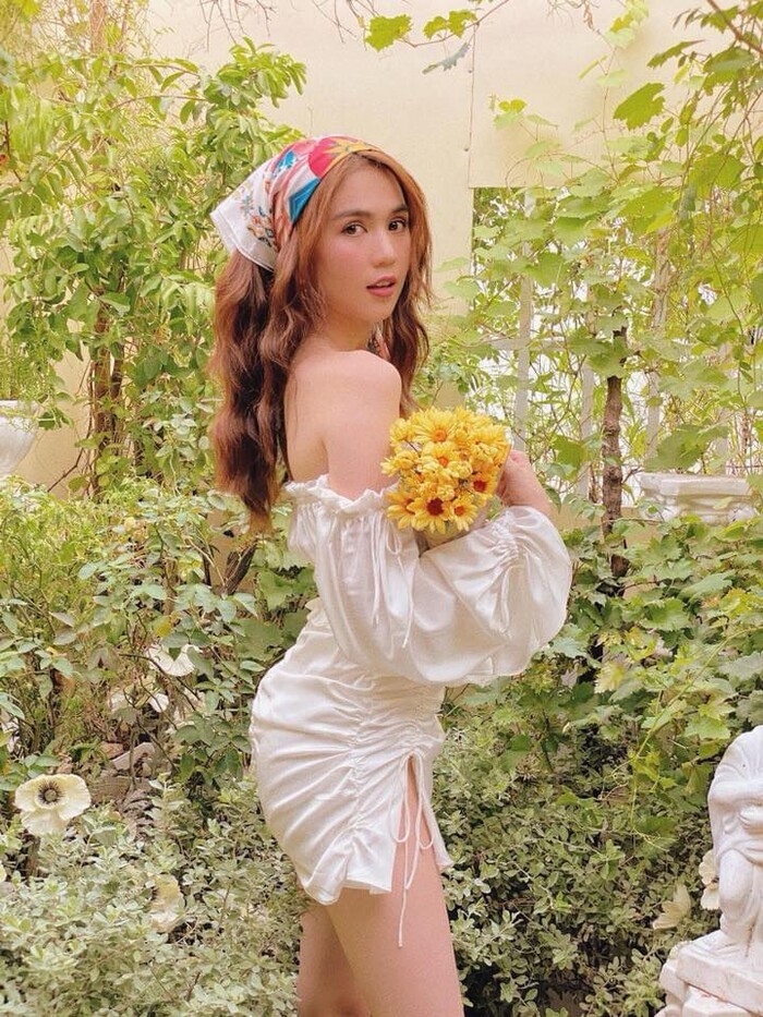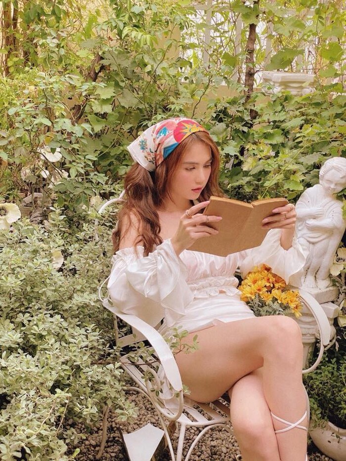 Chán khoe ảnh diện bikini, Ngọc Trinh mới đây lại hóa thân thành cô gái đồng quê vừa dịu dàng vừa sexy ngồi đọc sách giữa khu vườn hoa lá. Cô nàng khoác trên mình set đồ bèo nhún màu trắng trễ vai, xẻ vạt dáng siêu ngắn khoe đôi chân dài thẳng tắp, vòng 3 căng tròn gợi cảm. Ngọc Trinh còn kết hợp phụ kiện như sandals quấn dây "hot trend" cùng khăn turban quấn đầu.