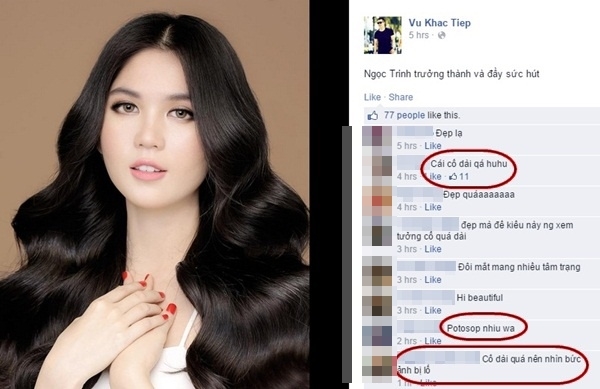 Trong bức hình mới nhất được đăng tải trên trang cá nhân của ông bầu Vũ Khắc Tiệp, đôi chân của Ngọc Trinh bị khán giả chê xấu như dị dạng vì chỉnh sửa quá đà.