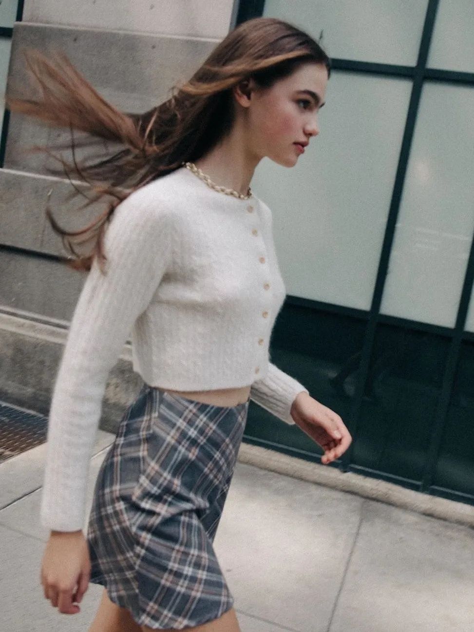 Vì chất liệu mỏng nhẹ nên bạn có thể diện áo cardigan có thể diện đơn thuần như 1 chiếc áo thun giúp tôn dáng hiệu quả, giữ ấm mà vẫn thật sành điệu trong ngày Thu Đông. Năm nay những kiểu áo cardigan dệt kim dáng crop top được khá nhiều cô nàng yêu thích vì giúp tôn dáng hiệu quả. Bạn có thể diện áo cardigan dệt kim dáng crop top cùng quần jeans, chân váy, quần vải cạp cao… là đã có ngay set đồ hack dáng cao ráo lại tôn eo thon rõ rệt. Vì kiểu áo này thường có thiết kế cổ chữ V nên bạn cũng đừng quên nhấn nhá với 1 chiếc vòng cổ nhỏ xinh để tôn lên xương quai xanh mảnh mai, hút mắt.