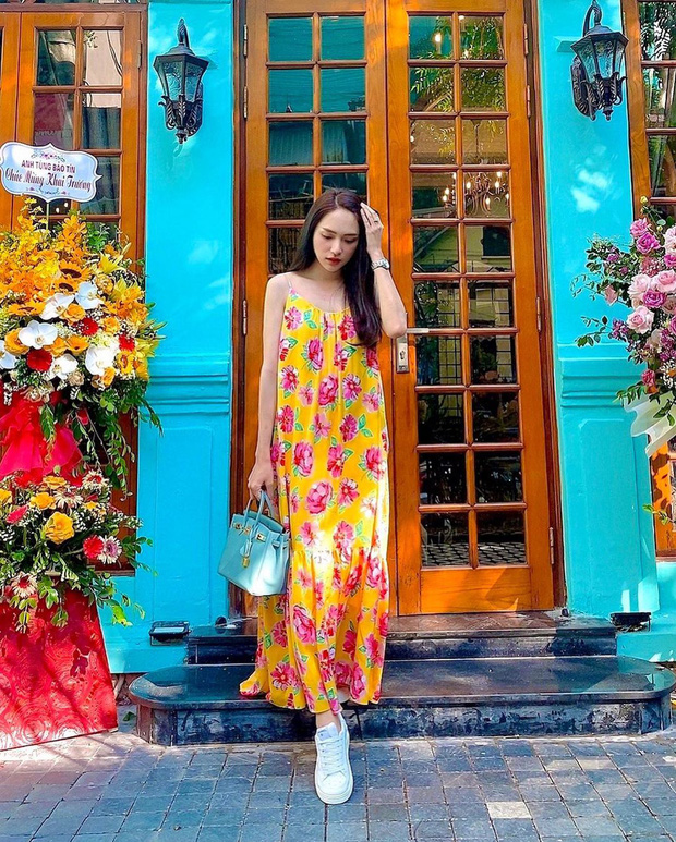 Đôi sneakers trắng với gam màu đơn giản trở thành mảnh ghép hoàn hảo hài hòa với bộ váy maxi họa tiết nổi bật mà Hương Giang đang diện