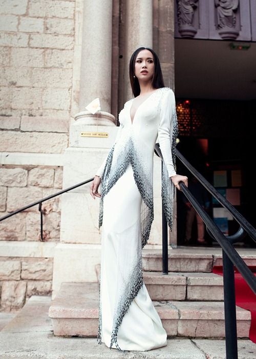 Diện trang phục xẻ tà vạt dài đính hoa 3D và đá lấp lánh, Hoa hậu Hoàn vũ Việt Nam 2017 rực rỡ khoe nhan sắc quyến rũ nhưng không kém phần quyền lực. Màu trắng của bộ trang phục còn giúp làm nổi bật làn da nâu khoẻ khoắn của chân dài sinh năm 1992.
