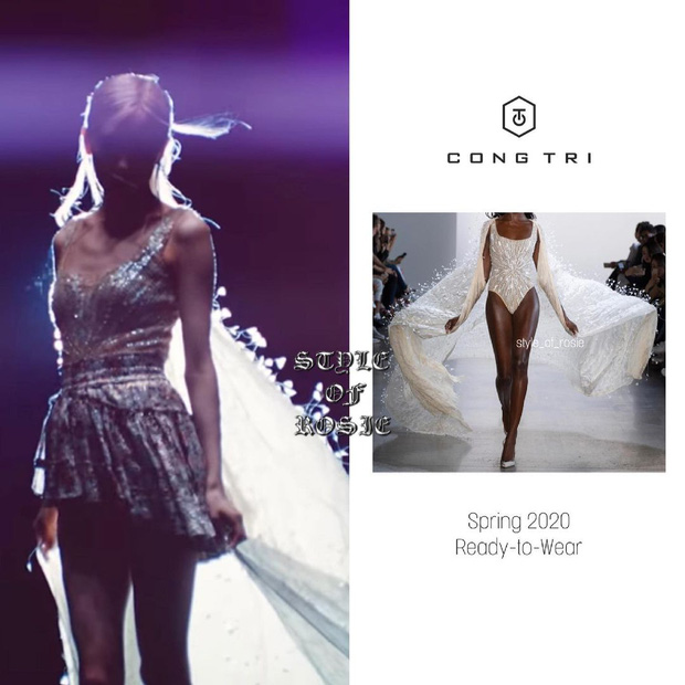 Chiếc váy của Rosé hiện đang khiến netizen xôn xao vì có phần áo lẫn khăn choàng y chang thiết kế nằm trong BST Xuân/Hè 2020 của "anh cả làng mốt Việt" - NTK Công Trí. Đặt 2 trang phục cạnh nhau, có thể thấy phần áo của Rosé có chất liệu và cách đính khá giống với mẫu bodysuit của NTK Công Trí. Ngoài ra, chi tiết đính lông vũ tua rua trên khăn choàng cũng giống nhau. Chính vì thế mà không ít cư dân mạng khẳng định đoá hồng BLACKPINK lần này đúng là diện đồ của NTK Công Trí rồi.