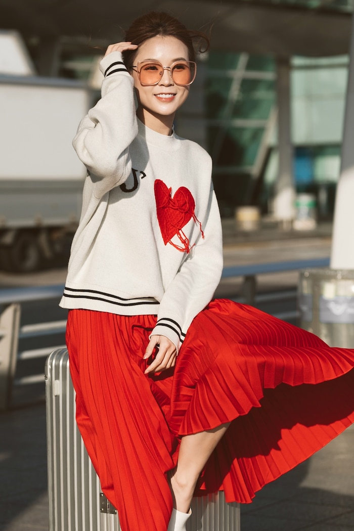 Trong bộ ảnh được tung ra, Sam xuất hiện với dáng vẻ rạng rỡ trẻ trung trong chiếc áo len màu trắng họa tiết trái tim mix cùng chân váy xếp ly đỏ rực rỡ. Dù đã bước sang tuổi 30 nhưng Sam vẫn đốn tim khán giả nhờ nhan sắc rực rỡ bất chấp tuổi tác.