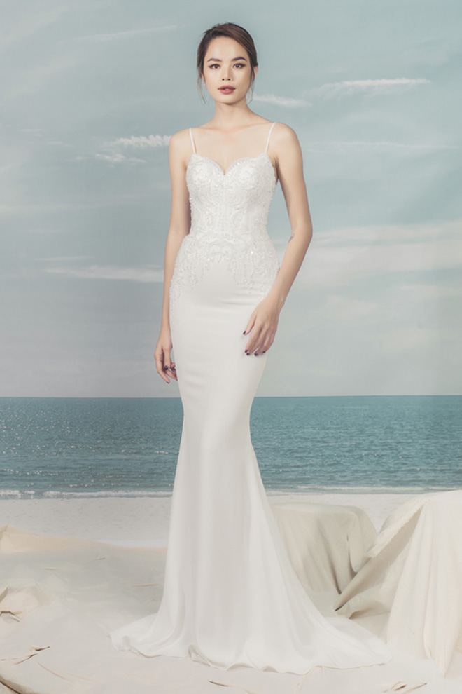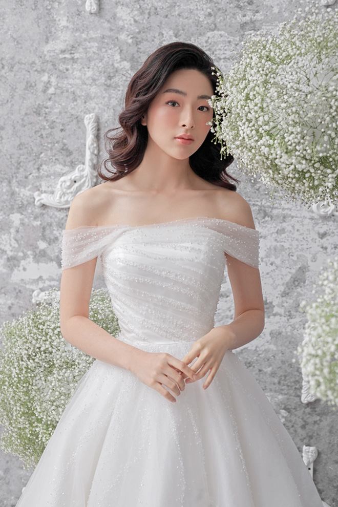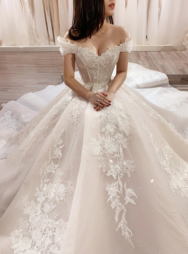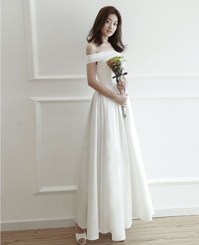 Đối với các nàng may mắn sở hữu chiếc cổ cao, xương quai xanh tuyệt mỹ cùng bờ vai "mlem" thì không còn mẫu váy cưới nào tuyệt hơn là kiểu váy trễ vai, tôn vinh những đường nét ngà ngọc. Ngoài ra kiểu váy được thắt eo lên tới gần chân ngực, phần tà váy bay bổng nhẹ nhàng sẽ gây "ảo giác" chân dài.