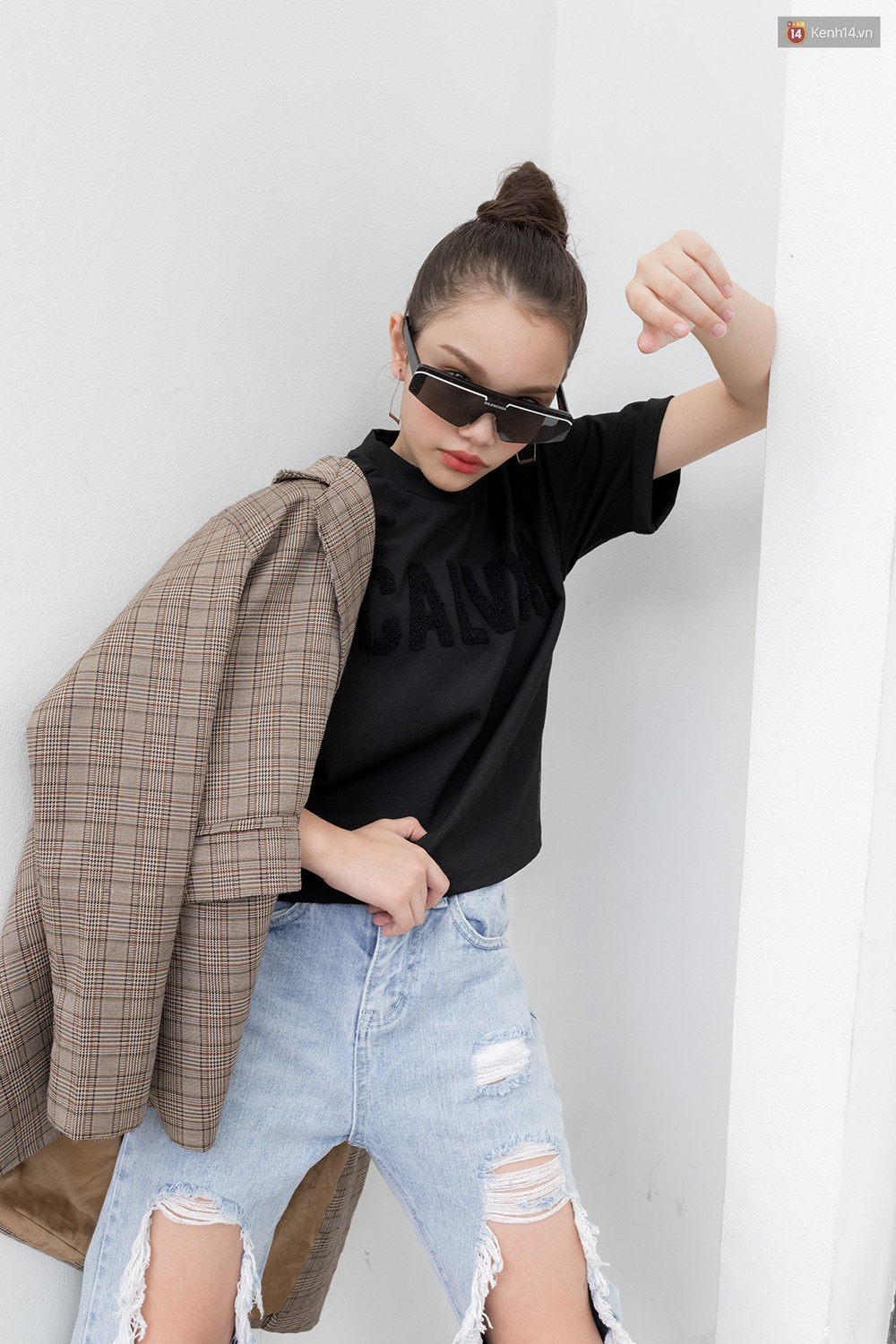 Trúc Linh mang đến gợi ý diện blazer không những không già chút nào mà còn cool hết nấc: mix với crop top và quần ống rộng.