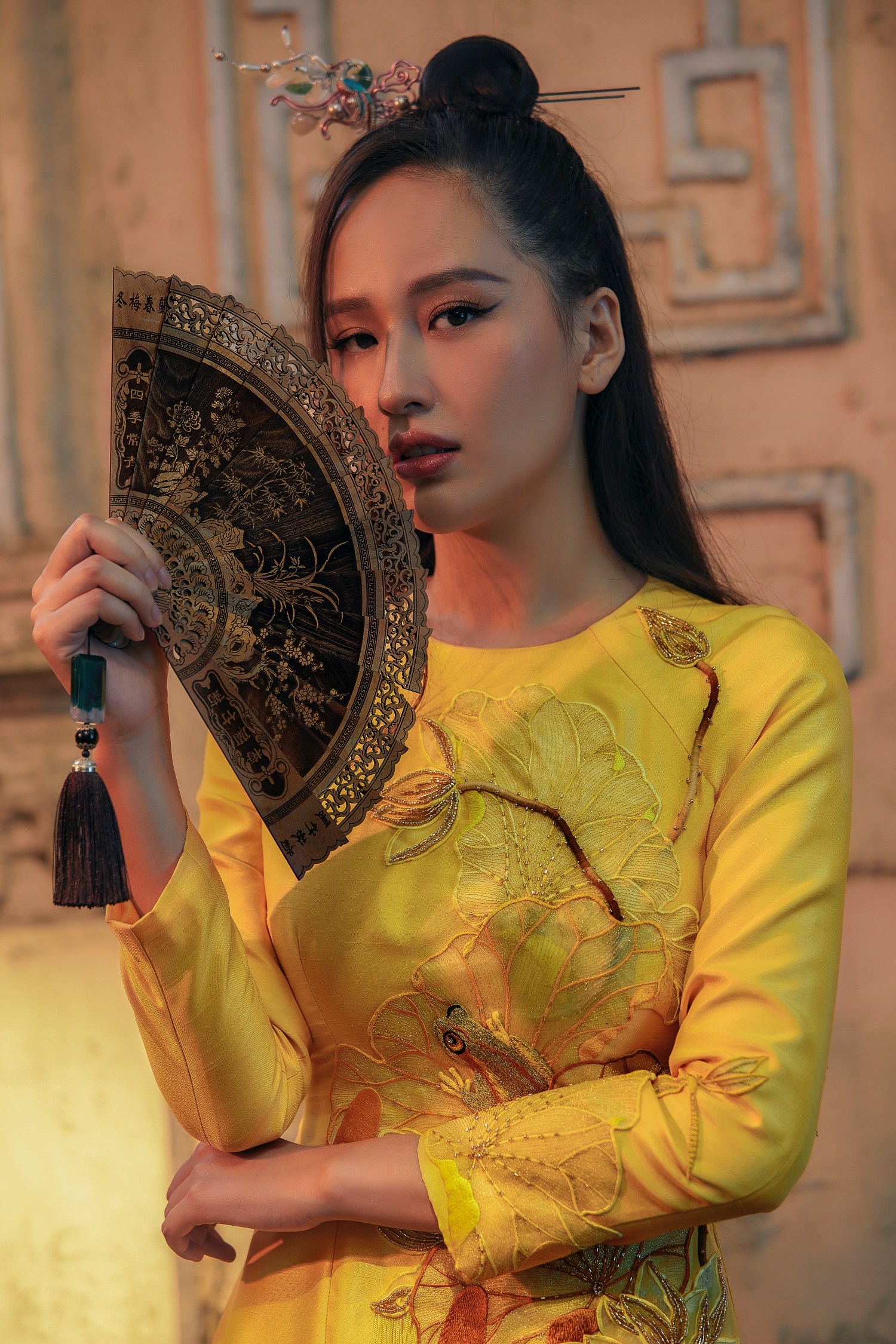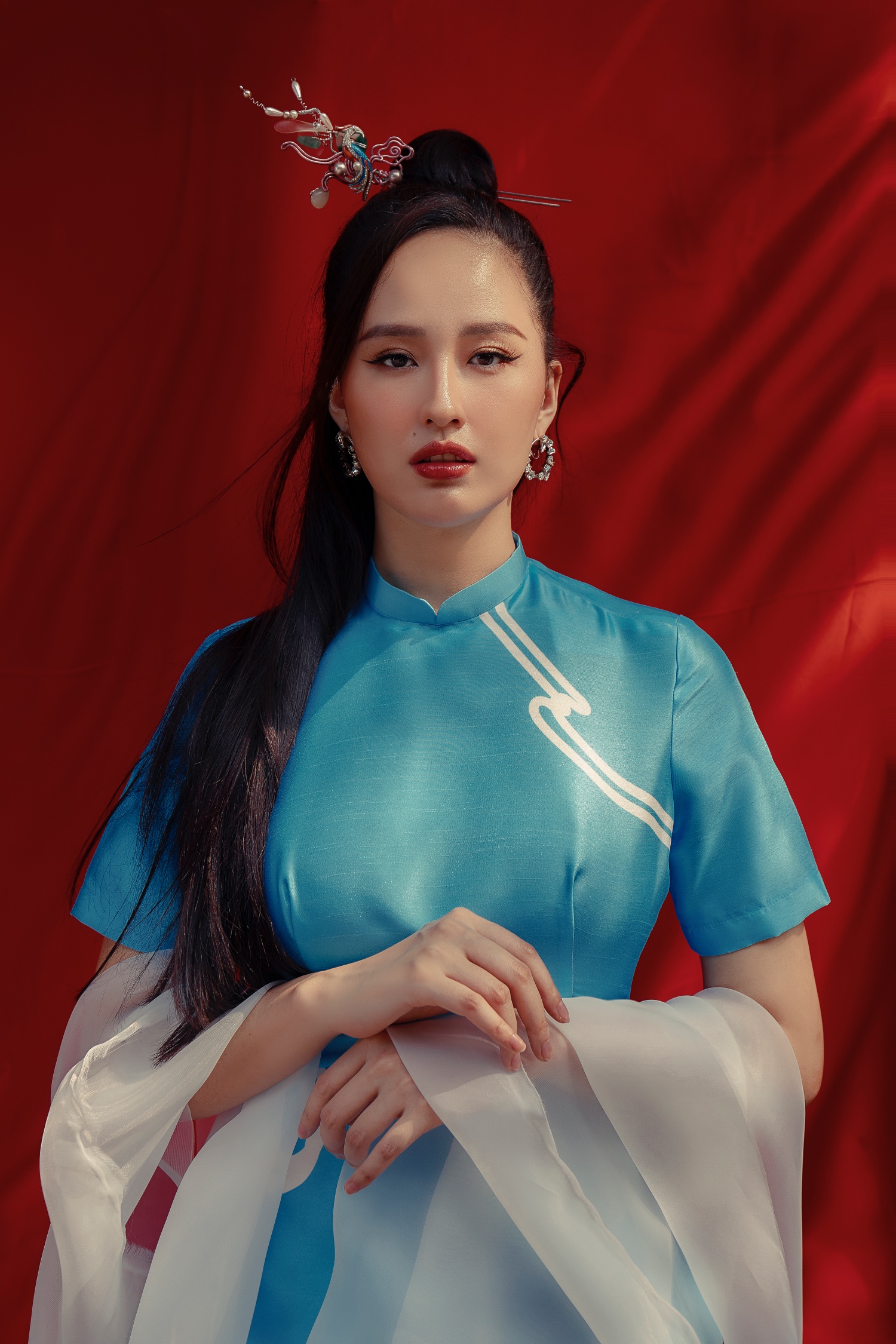 Với sự hỗ trợ của stylist Phong Trương cùng những thiết kế mới nhất của NTK Thủy Nguyễn và Lưu Ngọc Kim Khanh, Mai Phương Thúy thể hiện một góc cạnh thời trang mang tính truyền thống hiếm có trong những khung ảnh huyền bí này.