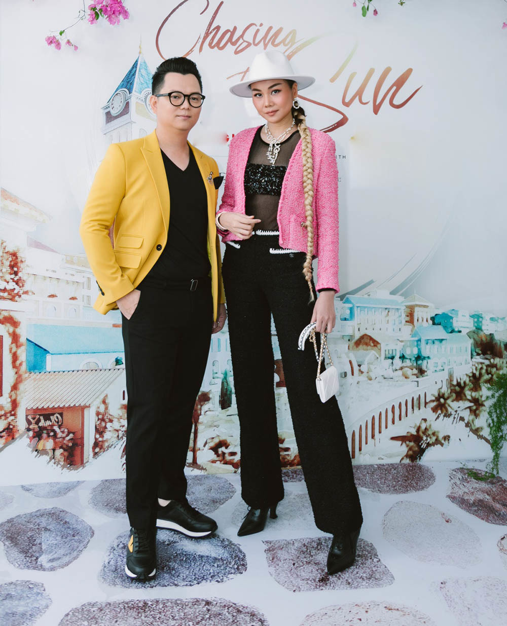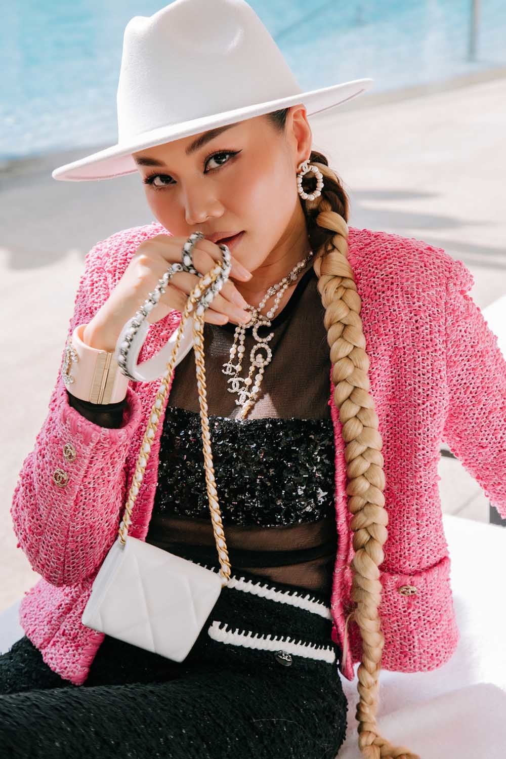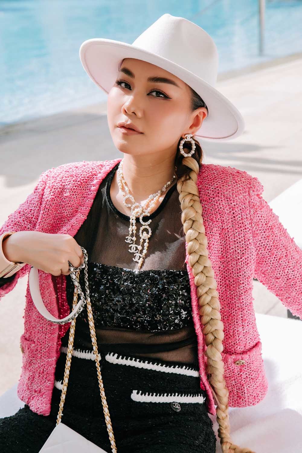 Siêu mẫu Thanh Hằng xuất hiện trong chiếc áo khoác tweed thanh lịch màu hồng tươi tắn. Nàng siêu mẫu phối cùng một chiếc mũ fedora trắng và túi xách Chanel cùng tông màu. Bên cạnh đó giày, dây chuyền, khuyên tai của Chanel cũng được Thanh Hằng mix-match ăn ý tạo nên sự hài hòa cho set đồ.