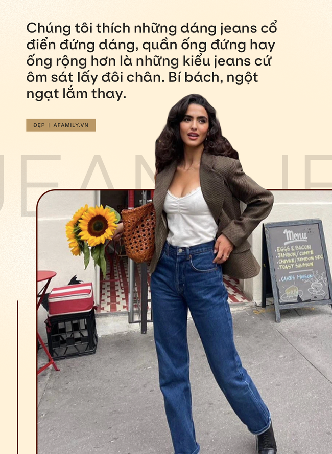 Gái Pháp họ ghét nhất là o ép đôi chân với quần skinny jeans, họ tôn thờ sự thoải mái tự do nên cứ là skinny họ sẽ bỏ qua hết. Với họ những dáng quần ống đứng, ống loe hay ống rộng... mới tôn dáng đôi chân, mới xứng đáng để họ đầu tư cho tủ đồ.