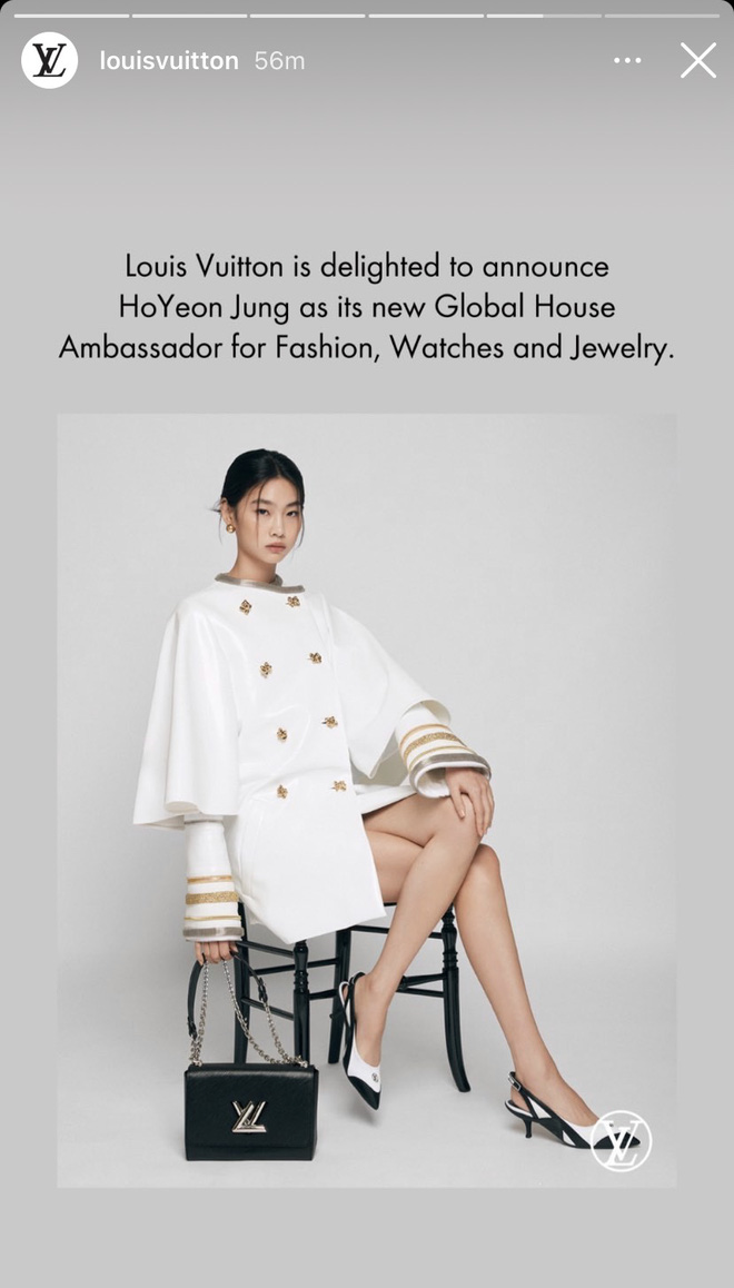 Trên trang Instagram chính thức của Louis Vuitton, siêu mẫu Hàn kiêm diễn viên Jung Ho Yeon được tuyên bố danh phận là đại sứ toàn cầu trên lĩnh vực thời trang, đồng hồ và trang sức.