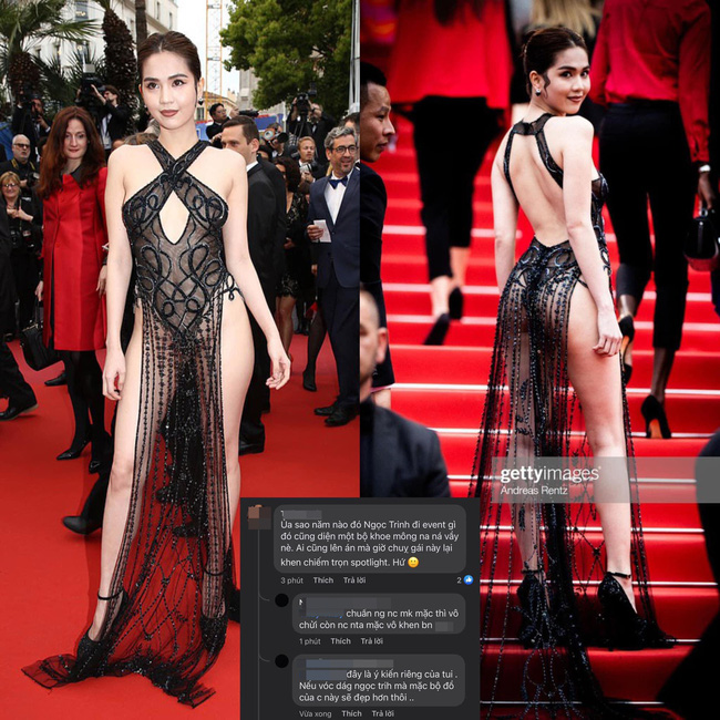 Nhìn sang Ngọc Trinh, cô diện đầm "toang hoác" của NTK Đỗ Long đến Cannes – nơi điện ảnh được đặt trên ngai vị cao nhất. Cô không mang đến Cannes tác phẩm điện ảnh nào, cũng chẳng góp ích gì cho sự kiện uy tín này ngoài phủ sóng các mặt báo Anh, Pháp, Trung… với đủ loại từ khóa "muối mặt" như "thiếu vải", "nội y khiêu dâm", "kém sang". Điều đó cho thấy ngay cả netizen trời tây vốn có gu thẩm mỹ phóng khoáng đến mấy cũng khó cảm nổi những hình ảnh Ngọc Trinh lưu lại tại thảm đỏ danh giá nhất nhì thế giới. Tính danh chính ngôn thuận của người đẹp Việt tại sự kiện này khiến dân tình vô cùng hoài nghi.