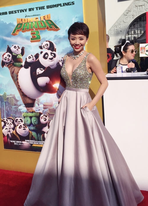 Khi tham dự sự kiện tại nước ngoài, giọng ca Ngày mai cũng biến mình thành tâm điểm nhờ trang phục theo xu hướng này, gần đây nhất là ở lễ ra mắt phim Kungfu Panda 3 tại Mỹ, ngày 17/1. |