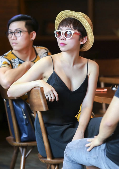 Cả ở đời thường, Tóc Tiên cũng có style phóng khoáng, hiện đại, không ngại mặc áo hai dây trễ nải khi đi cafe với bạn bè. |