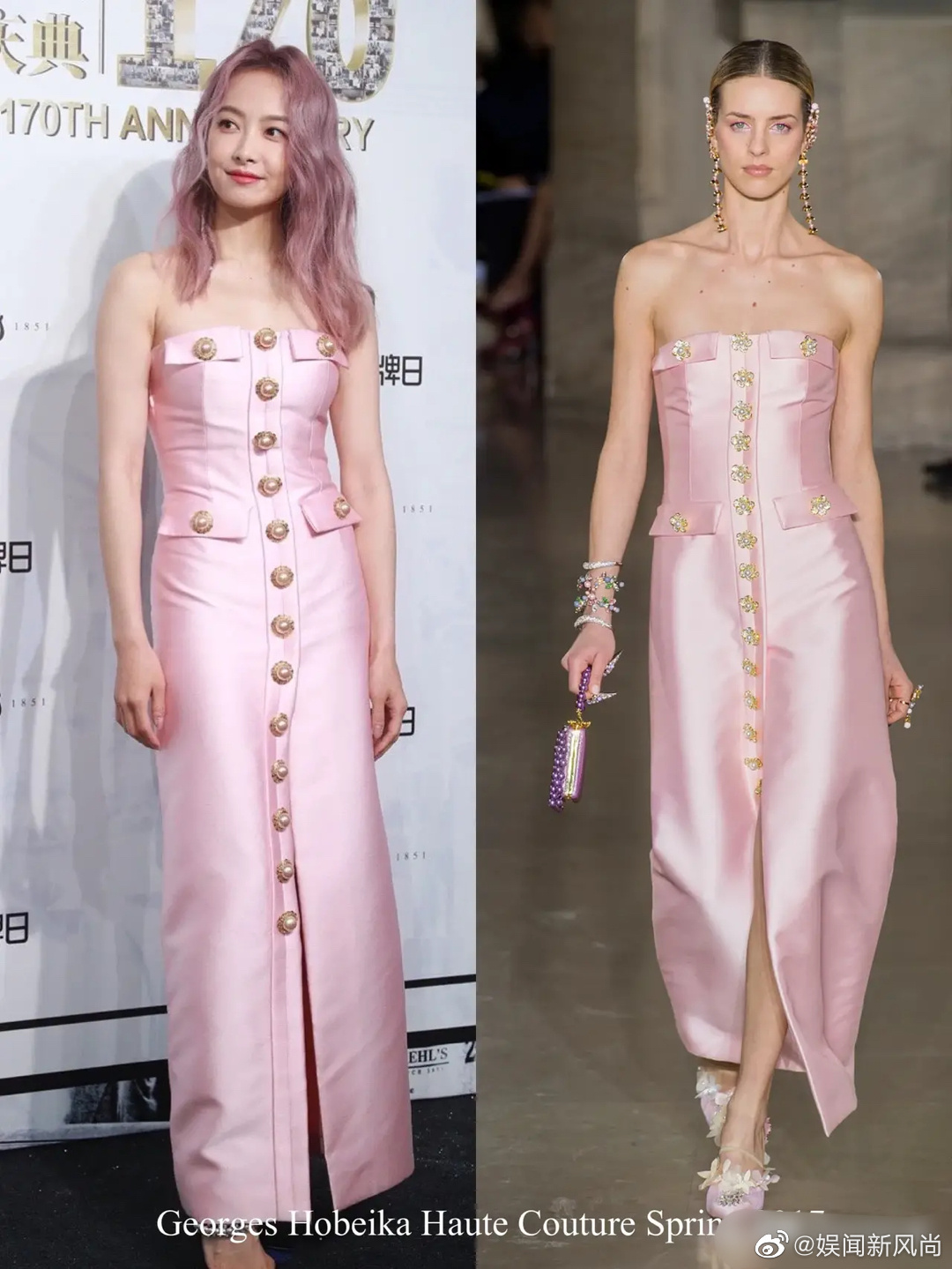 Tại sự kiện mới, Tống Thiến diện mẫu váy liền mang tông hồng ngọt ngào. Cô còn cố tình nhuộm tóc tông hồng tím để có được hình ảnh đồng bộ với bộ cánh mà mình đã diện.