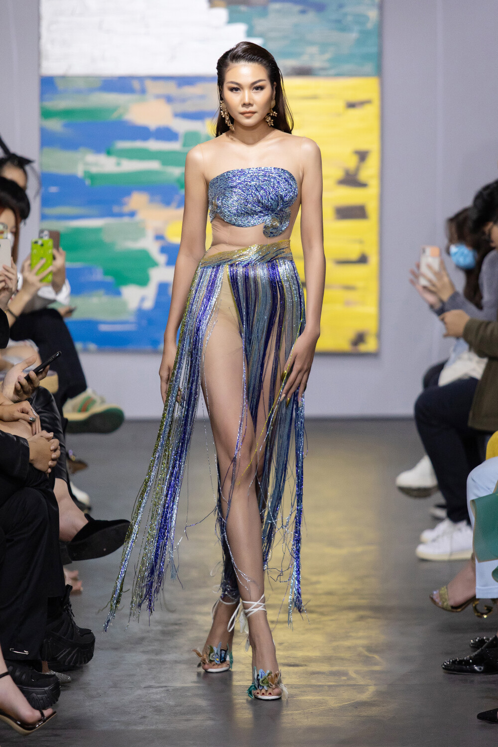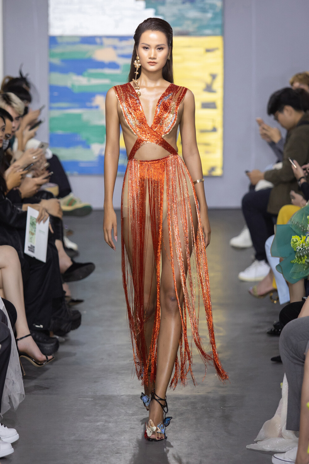 Hai vedette của show diễn - Hương Ly và siêu mẫu Thanh Hằng xuất hiện trong thiết kế đầm tua rua cực kì gợi cảm, lấp ló những đường cong quyến rũ qua từng sợi tua.