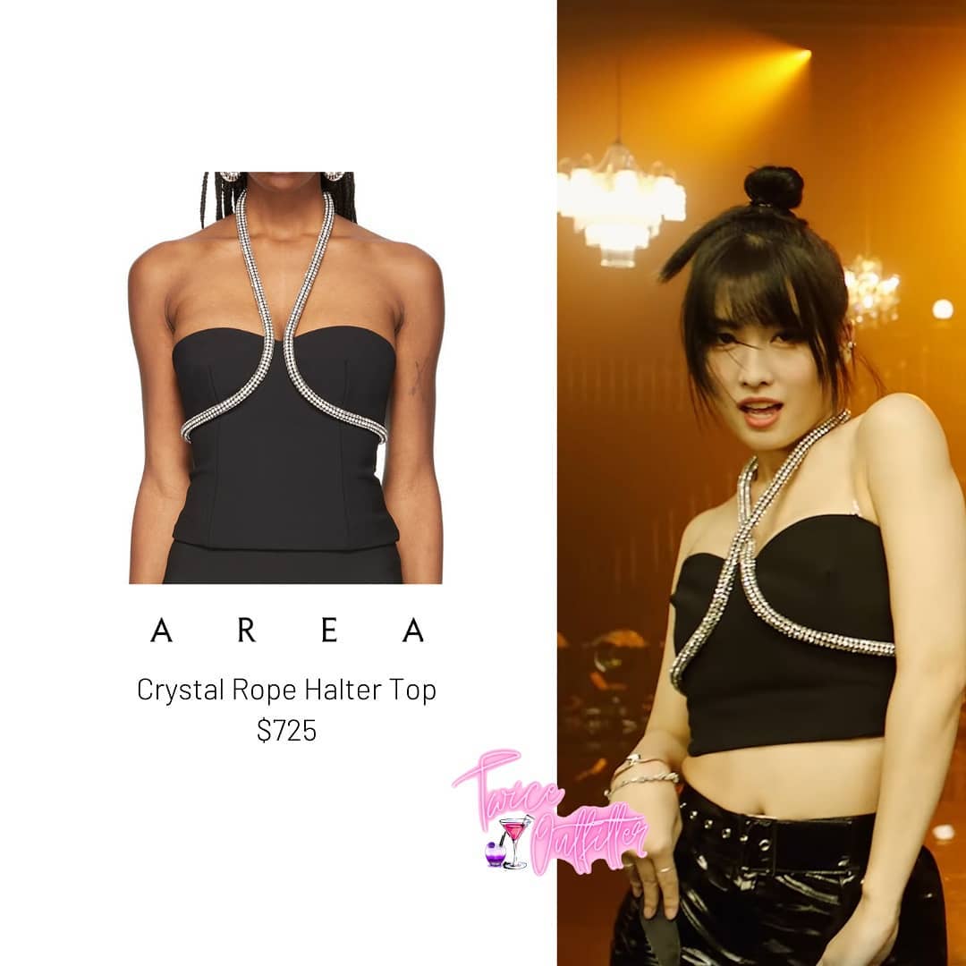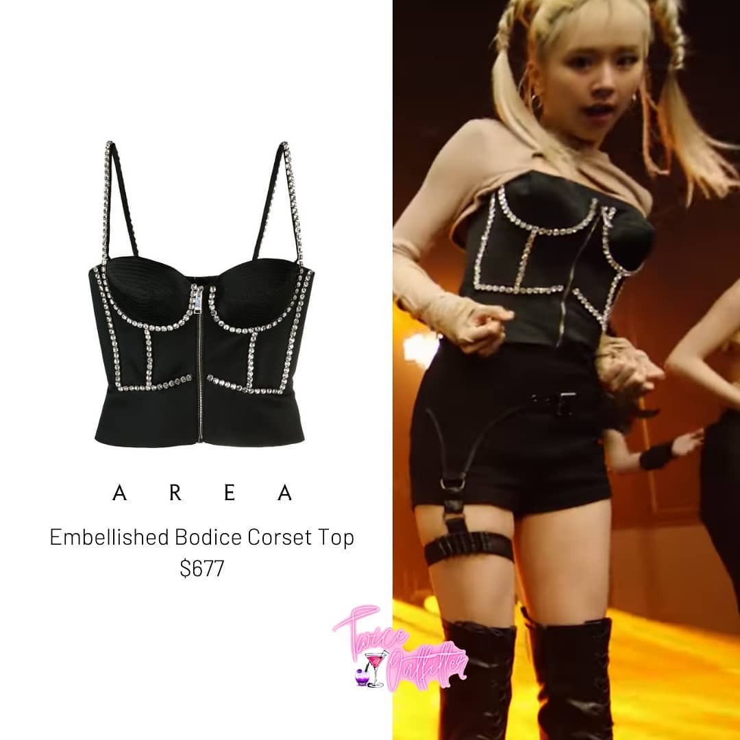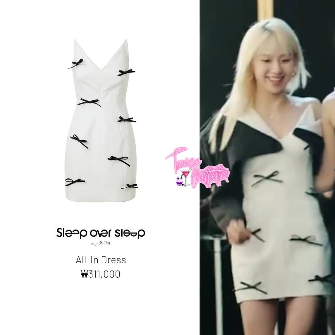 Váy của David Koma vốn là thiết kế dáng dài nhưng stylist đã cắt thành váy dáng ngắn tạo hiệu ứng vừa tôn dáng lại giúp Dahyun trông trẻ trung hơn.