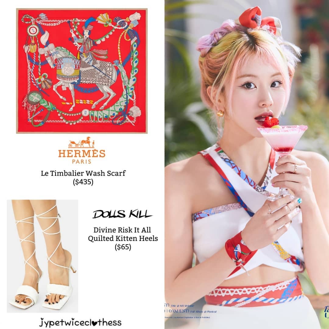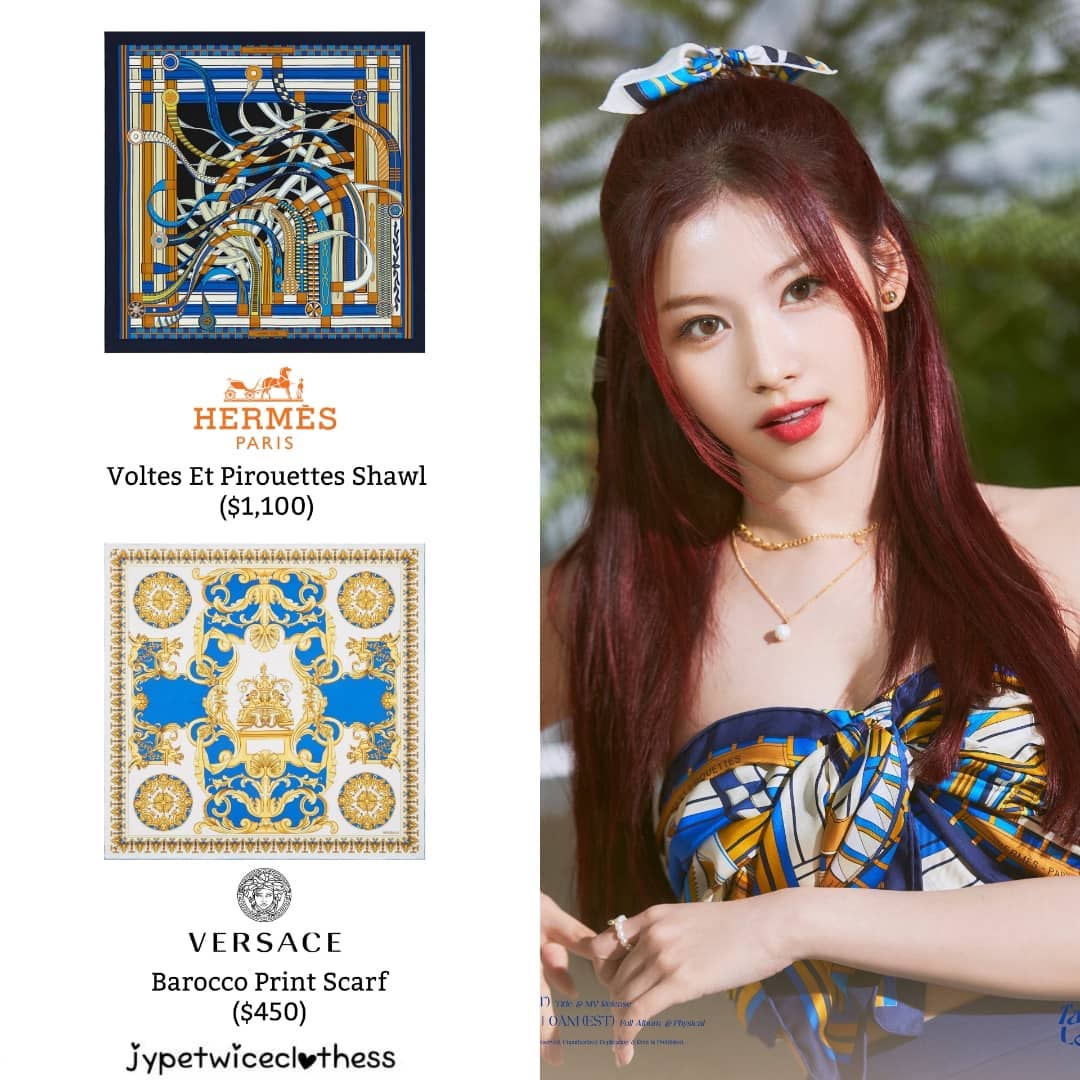 Tuy nhiên, ai rồi cũng khác, trong màn comeback mới đây của 9 cô gái, stylist của Twice chẳng ngại chế khăn Hermès, Louis Vuitton, Versace... đắt đỏ thành trang phục giúp họ có được diện mạo vừa thu hút lại vừa sang chảnh.