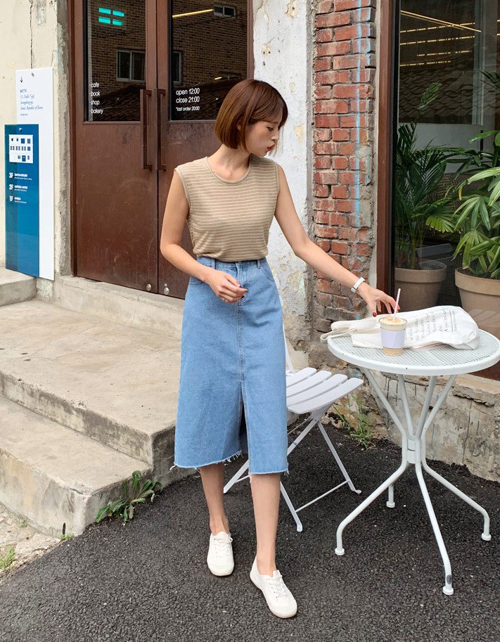 Chất liệu jeans vốn đã mang nét trẻ trung, trendy, bất cứ ai diện lên cũng sẽ trông trẻ trung ra vài tuổi. Thêm vào đó, thiết kế này còn nhấn nhá thêm với đường xẻ vạt nên lại càng phá cách ấn tượng hơn. Chính đường xẻ vạt này cũng giúp hướng ánh nhìn theo chiều dọc, khiến chân trông dài hơn và vóc dáng cao ráo hơn đáng kể.