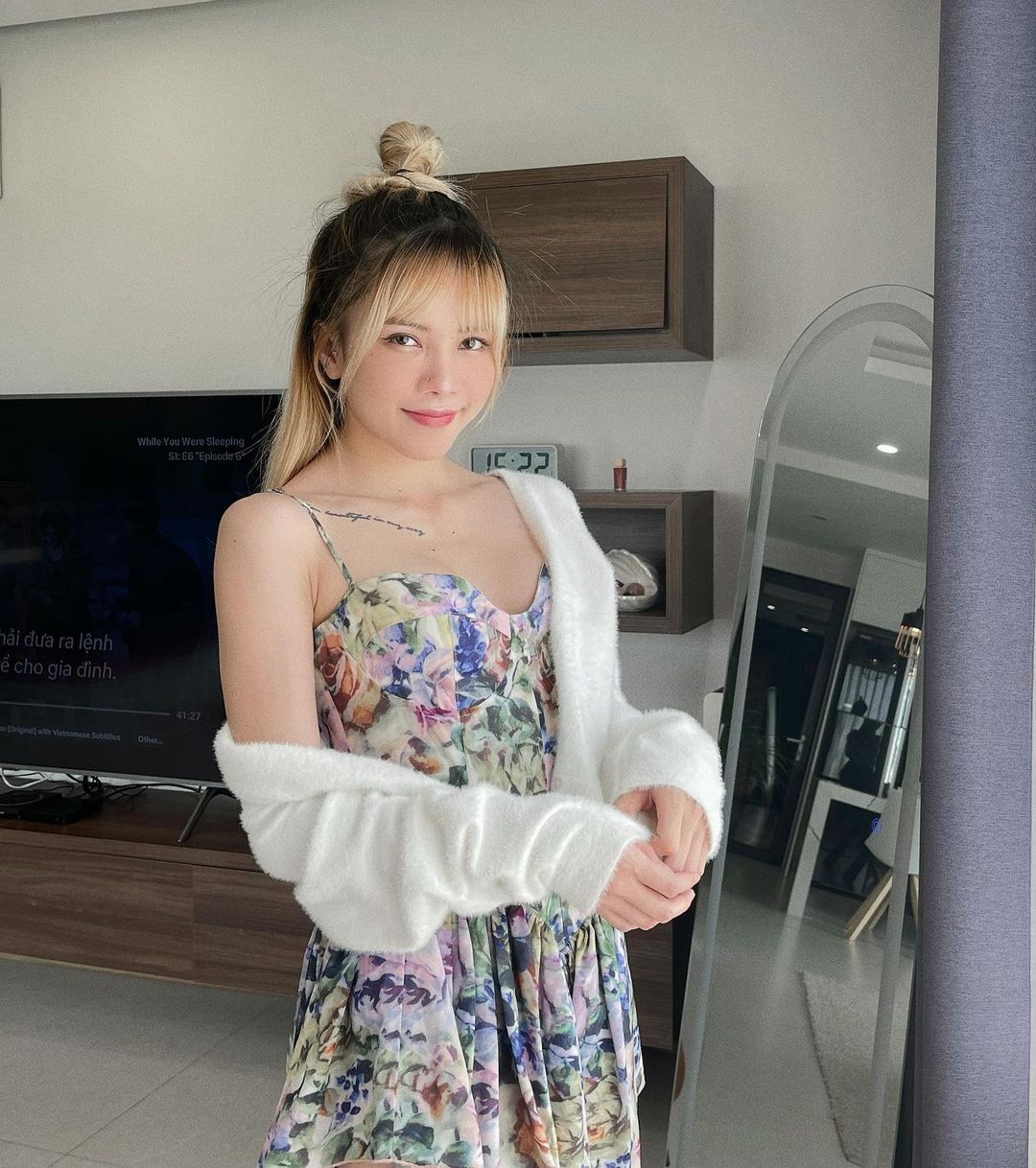 Váy hoa nữ tính ngọt ngào mix cùng áo cardigan lông càng giúp hình ảnh Thiều Bảo Trâm thêm phần xinh xắn, điệu đà. Vì váy hoa vốn đã có nhiều họa tiết nên Thiều Bảo Trâm đã mix cùng áo cardigan trắng để tránh rối mắt. Cô còn để kiểu tóc búi nửa nên càng thêm phần trẻ trung, xinh xẻo.