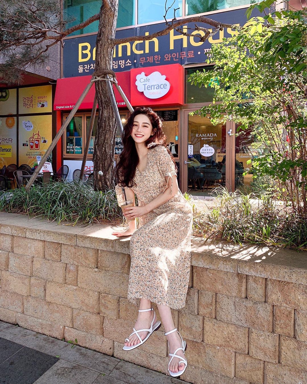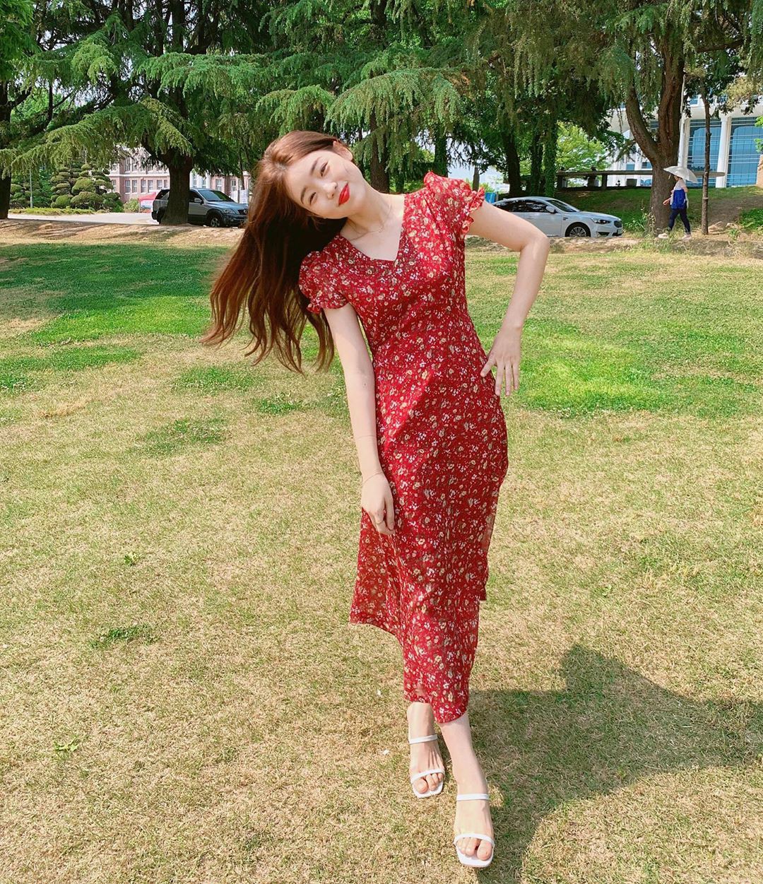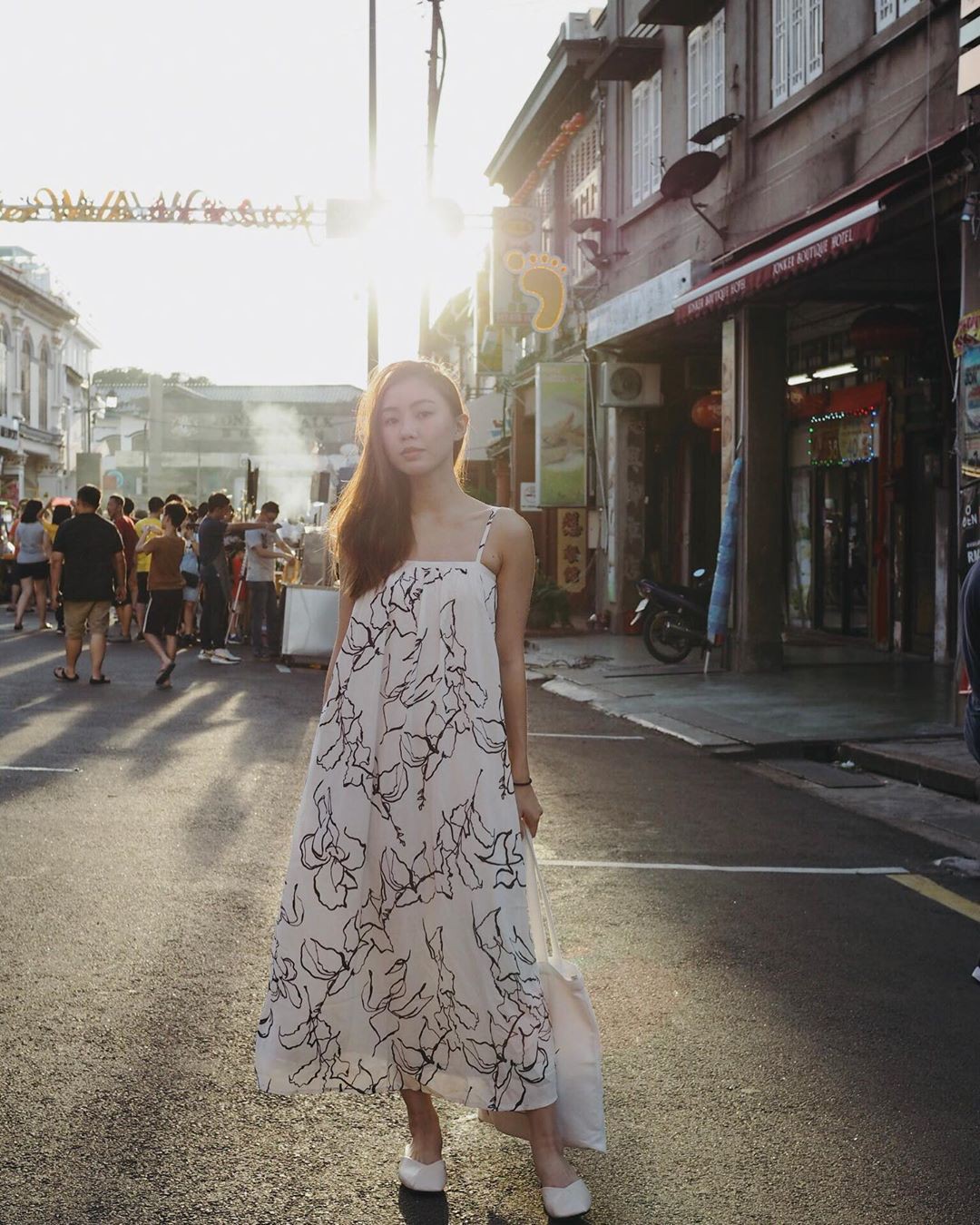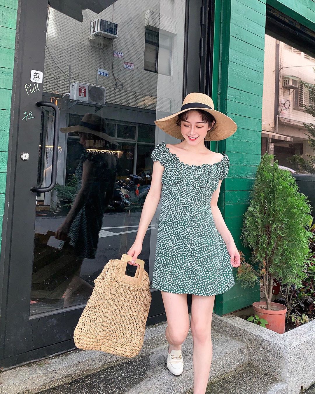 1. Váy họa tiết + giày tối giản