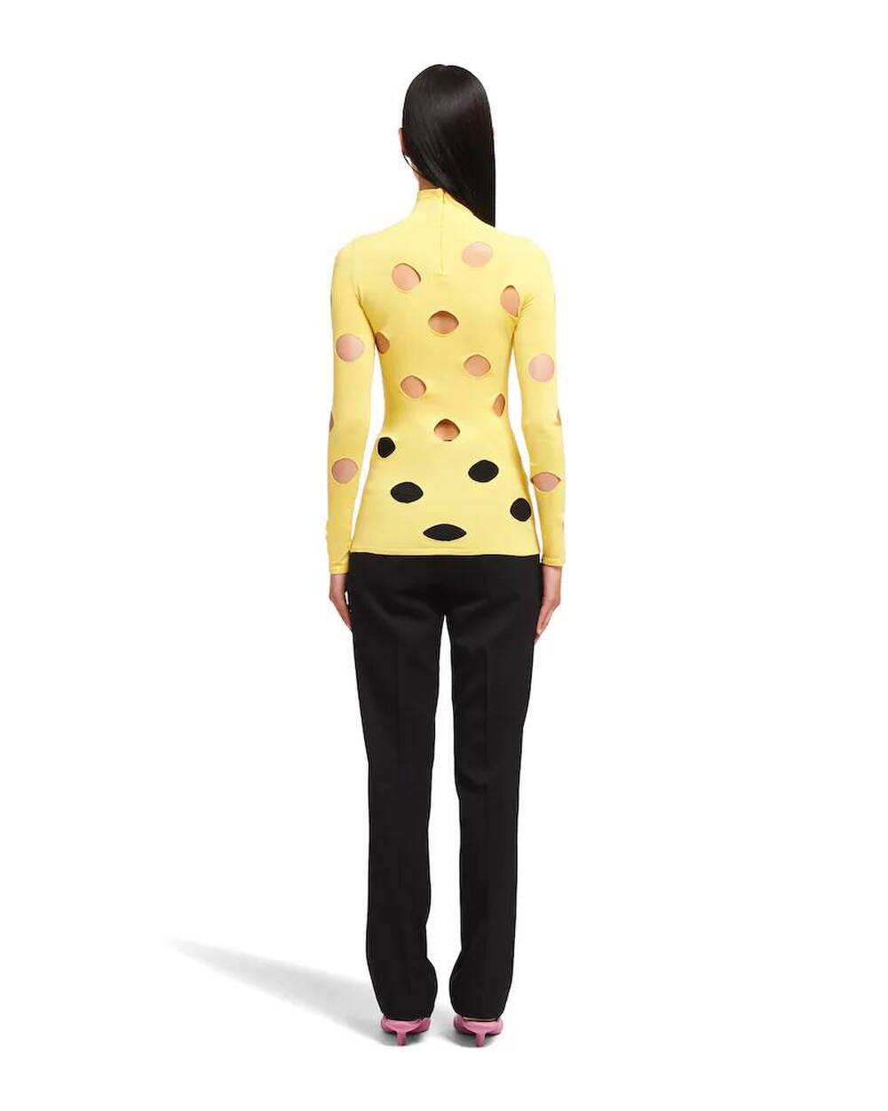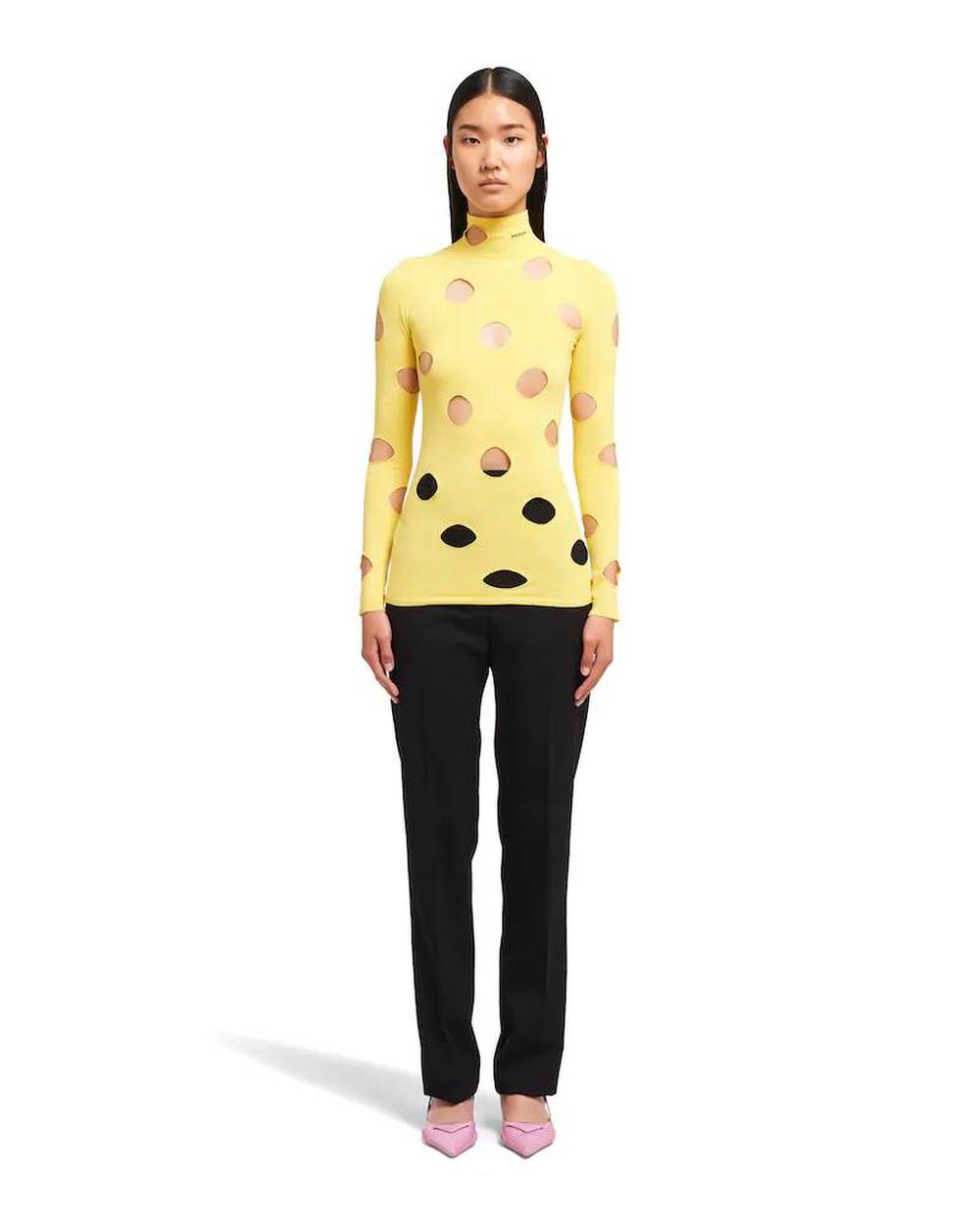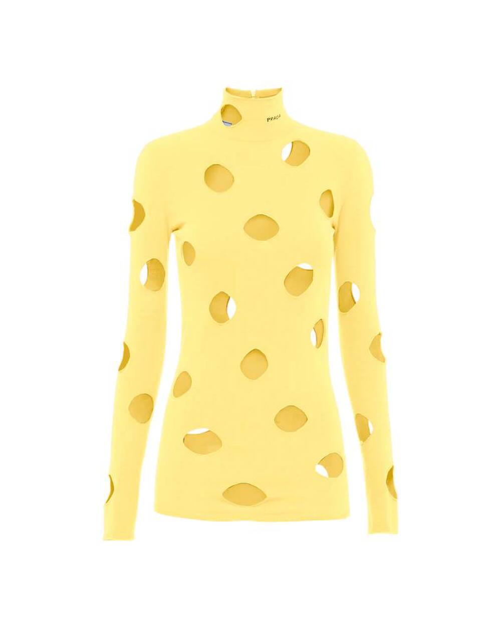Thương hiệu Prada đón nhận loạt ý kiến trái chiều khi cho ra mắt mẫu áo nỉ cổ lọ màu vàng, có nhiều chi tiết hở. Những lỗ hổng trên thân áo khiến thiết kế được ví với phô mai trong phim hoạt hình nổi tiếng Tom & Jerry.