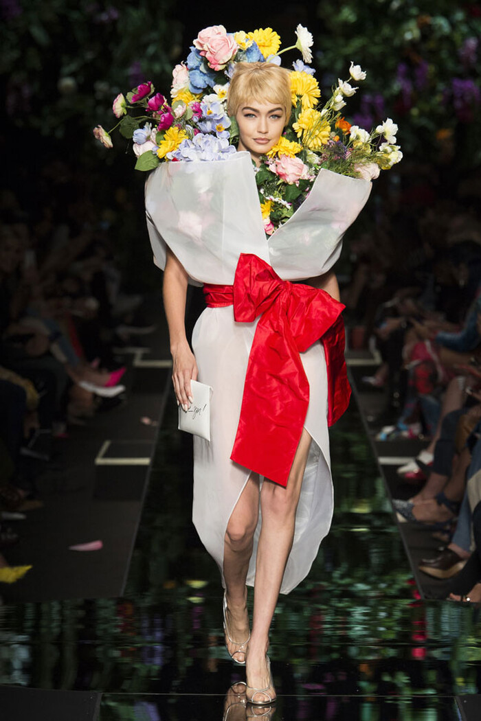 Chính vì thiết kế quá ấn tượng mà nhiều tín đồ thời trang lập tức nhớ đến sáng tạo của nhà mốt Moschino ở tuần lễ thời trang Xuân Hè năm 2018. Trong khi chiếc váy của Moschino trông hệt như một bó hoa khổng lồ thì thiết kế mà Hoàng Thùy mặc đã thay đổi phần tùng và cách sắp xếp hoa lá phần thân trên, giữ nguyên màu trắng của giấy bọc và chiếc nơ màu đỏ.