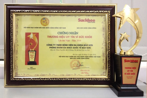 Cup và Bằng chứng nhận “Thương hiệu uy tín vì sức khỏe” là sự ghi nhận những đóng góp của Phòng khám Đa khoa Quốc tế Bảo Sơn trong công tác chăm lo, bảo vệ sức khỏe cộng đồng |