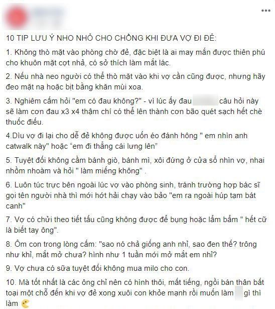 Nhiều người không có kinh nghiệm đã gây ra không ít cảnh dở khóc dở cười lúc chờ vợ đẻ. Đúc rút kinh nghiệm "xương máu" của mình, mới đây, trên mạng xã hội bất ngờ lan truyền một bài viết về "10 lưu ý nho nhỏ cho chồng khi đưa vợ đi đẻ" đã thu hút đông đảo sự quan tâm của cư dân mạng. Cụ thể, 10 lưu ý đó là: