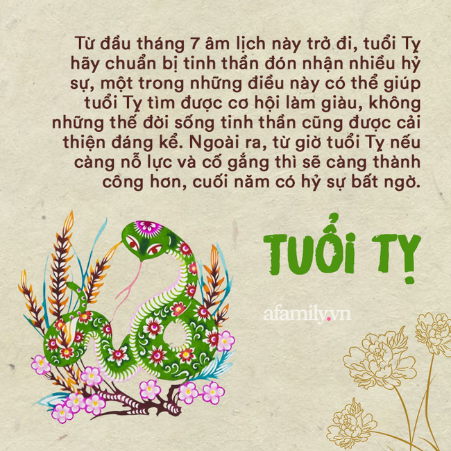 Tử vi học có nói, trong năm 2021 này, cuộc sống của tuổi Tỵ có nhiều chuyển biến bất ngờ. Mặc dù những tháng đầu năm, tuổi Tỵ đã phải đối mặt với nhiều thử thách, thậm chí có mất mát nhưng họ vẫn kiên cường và nhẫn nại, vẫn luôn cố gắng chăm chỉ tìm kiếm cơ hội để lật ngược tình thế. Từ đầu tháng 7 âm lịch này trở đi, tuổi Tỵ hãy chuẩn bị tinh thần đón nhận nhiều hỷ sự, một trong những điều này có thể giúp tuổi Tỵ tìm được cơ hội làm giàu, không những thế đời sống tinh thần cũng được cải thiện đáng kể. Ngoài ra, từ giờ tuổi Tỵ nếu càng nỗ lực và cố gắng thì sẽ càng thành công hơn, cuối năm có hỷ sự bất ngờ.