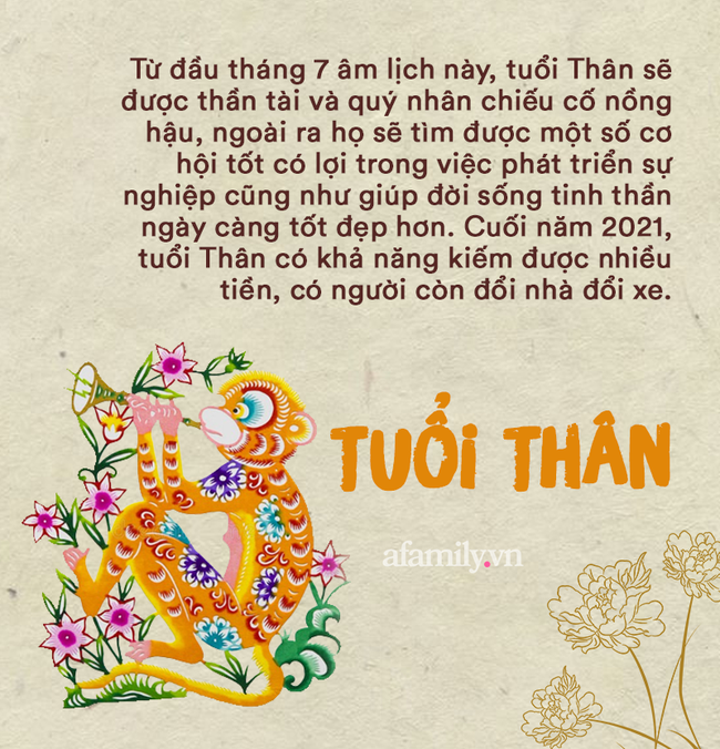 Tử vi học có nói, trong năm 2021 này, cuộc sống tuổi Thân có nhiều biến động bất ngờ. Nửa năm đầu tuổi Thân đã phải đối mặt với nhiều khó khăn, trắc trở, thậm chí còn mất mát và tổn thất nhiều thứ. Thế nhưng, từ nửa cuối năm trở đi, cuộc sống khổ tận cam lai. Cụ thể, từ đầu tháng 7 âm lịch này, tuổi Thân sẽ được thần tài và quý nhân chiếu cố nồng hậu, ngoài ra họ sẽ tìm được một số cơ hội tốt có lợi trong việc phát triển sự nghiệp cũng như giúp đời sống tinh thần ngày càng tốt đẹp hơn. Cuối năm 2021, tuổi Thân có khả năng kiếm được nhiều tiền, có người còn đổi nhà đổi xe.