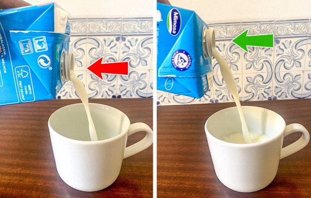 Khi đổ một hộp sữa hoặc nước hoa quả còn đầy với nắp hộp phía thấp, dung dịch bên trong có thể văng ra khắp nơi, bởi chiếc hộp có xu hướng cân bằng áp suất. Vậy nên bạn cần phải để không khí bên trong hộp thoát ra trước, bằng cách đổ sữa theo hướng nắp hộp ở trên cao hơn.