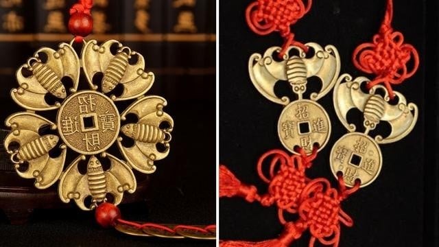 Đồng xu vàng tượng trưng cho sự hòa hợp đất trời mang lại nhiều may mắn cho người đeo. Treo đồng xu trên bàn làm việc sẽ mang lại nhiều may mắn, công việc sẽ luôn thuận lợi và đạt được nhiều thành công.