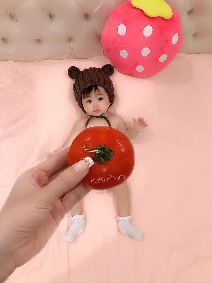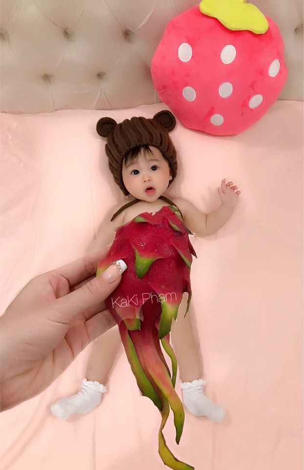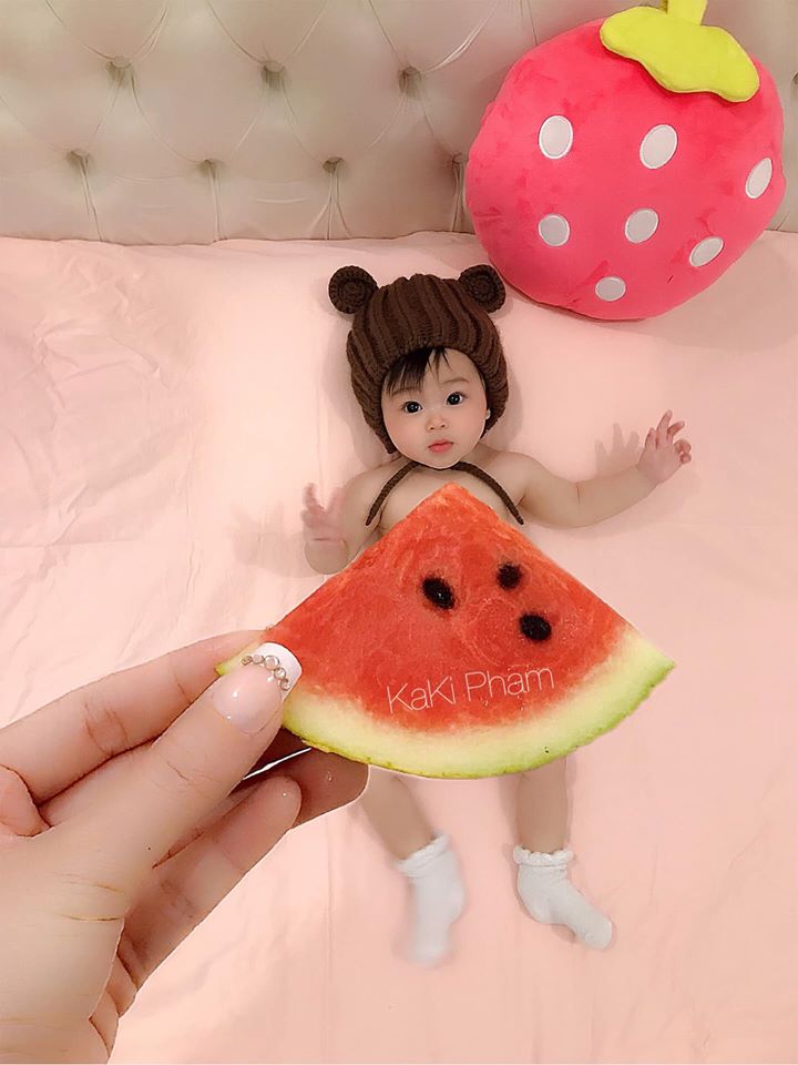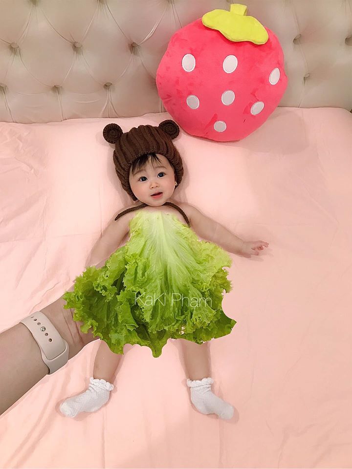 "Siêu mẫu" trong ảnh là bé Giáp Song Nhi (11 tháng tuổi). Cô bé được mẹ "diện" cho những bộ mốt có một không hai từ những rau củ quả quen thuộc hàng ngày như lát cam, súp lơ, thanh long, dưa hấu, rau xà lách,... Với cách chụp khéo léo, mẹ Kaki Nguyễn đã tạo nên những bộ váy áo lộng lẫy nhiều màu sắc và vô cùng dễ thương. Còn bé Giáp Song Nhi thì phối hợp vô cùng ăn ý với mẹ khi có những biểu cảm vô cùng dễ thương.
