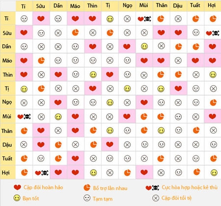 Theo chiêm tinh học Trung Quốc, nói chung những người đẻ cách nhau bốn năm thường tương thích (tam hợp), nhưng cách nhau sáu năm thì không nên (tứ hành xung). Bạn có thể kiểm tra tuổi hợp trước khi bắt đầu một mối quan hệ.