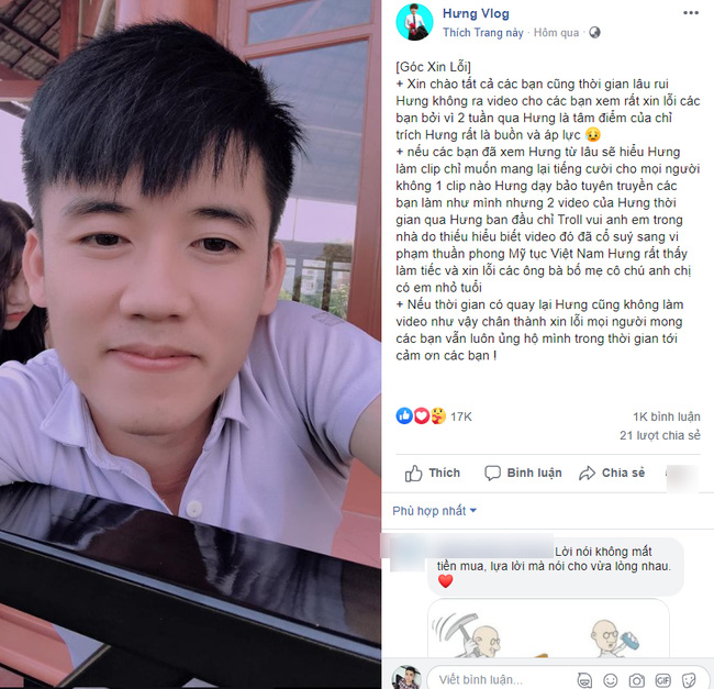 Trong bài viết dài, Hưng Vlog viết: "Góc Xin lỗi! Xin chào tất cả các bạn, cũng lâu rồi Hưng không ra video cho các bạn xem. Rất xin lỗi các bạn bởi vì 2 tuần qua Hưng là tâm điểm của chỉ trích. Hưng rất buồn và áp lực.