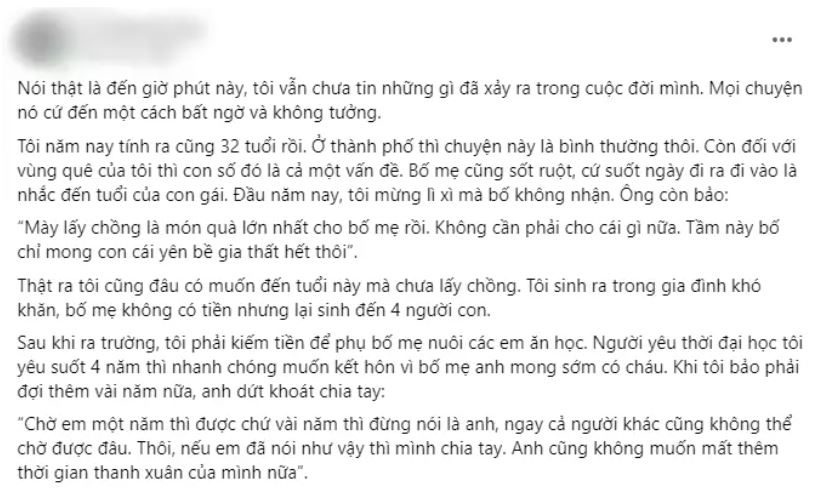 Thật ra tôi cũng đâu có muốn đến tuổi này mà chưa lấy chồng. Tôi sinh ra trong gia đình khó khăn, bố mẹ không có tiền nhưng lại sinh đến 4 người con.