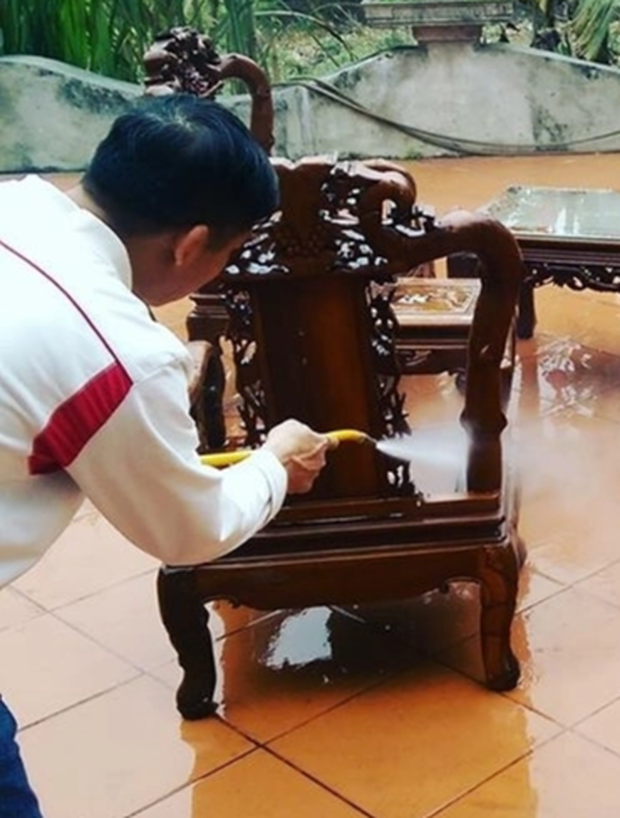 Thay vì phải lau bằng tay tốn thời gian và công sức thì một số người đã nghĩ ra cách sáng tạo là dùng tăm nước với lực xịt mạnh để đi hết chất bẩn ở những món đồ nội thất gỗ nhiều hoa văn chạm trổ.