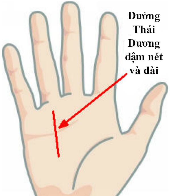 Còn có tên gọi là đường Thái Dương, là đường thẳng đứng từ ngón tay áp út chạy thẳng xuống. Nếu người phụ nữ nào có đường này rõ ràng, mọi thứ sẽ vô cùng suôn sẻ. Khả năng cao, bạn sẽ kết hôn với một người đàn ông giàu có, có tài cao.