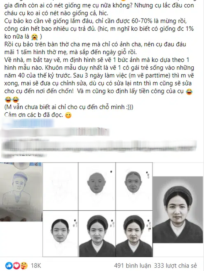 Cụ đưa mình tờ giấy đó, rồi nhờ mình vẽ giúp mẹ của cụ. Cụ kể, cụ mồ côi mẹ từ lúc lên 6, mẹ cụ mất lúc còn khá là trẻ (37 tuổi), cụ bảo cụ không nhớ rõ lắm nữa, nhưng cụ vẫn nhớ mẹ rất đẹp, mắt hiền, đầu đội khăn vấn, mặc áo yếm nên cụ vẽ hết ra giấy đây.