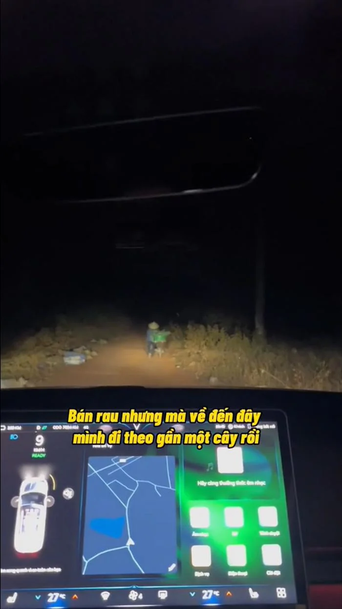 Nói trong clip, người đàn ông cho biết anh đã kiên nhẫn đi chầm chậm soi đèn hơn 1 km vì lo sợ cô bán ràu đi về trời tối, không thấy đường hoặc lỡ không may gặp người xấu. Sau khi theo được quãng đường dài, anh và vợ quyết định xuống xe ô tô hỏi thăm cô.
