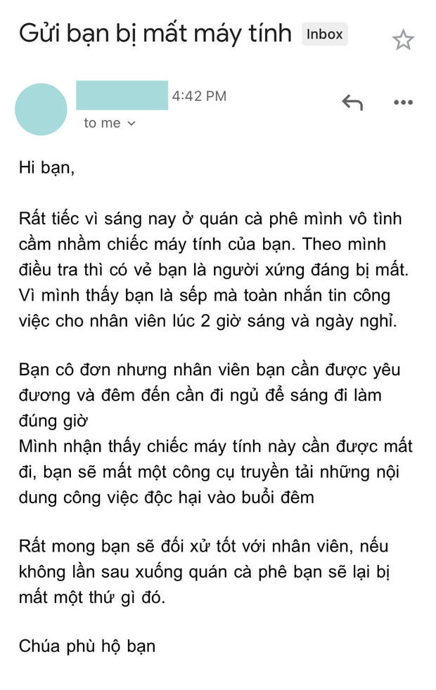 30/10/2021 15:25Ăn cắp còn dám la làng, kẻ trộm laptop ngang ngược gửi email giảng đạo lý với nạn nhân, nội dung bất ngờ khiến dân tình đồng loạt 'quay xe'