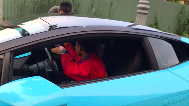 Chiếc siêu xe có màu xanh da trời đẹp mắt, nhìn từ bên ngoài đã thấy mùi tiền phảng phất! Trên đường, có một nhóm thanh niên đứng chờ sẵn, khi nam shipper mở cửa kính xe thì ai cũng hỏi "giao đồ ăn đúng không anh?". Đáp lại, anh shipper mặc áo đỏ đưa ổ bánh mì cho khách rồi cười bảo "thôi, khỏi lấy tiền", sau đó liền nẹt pô phóng xe đi.